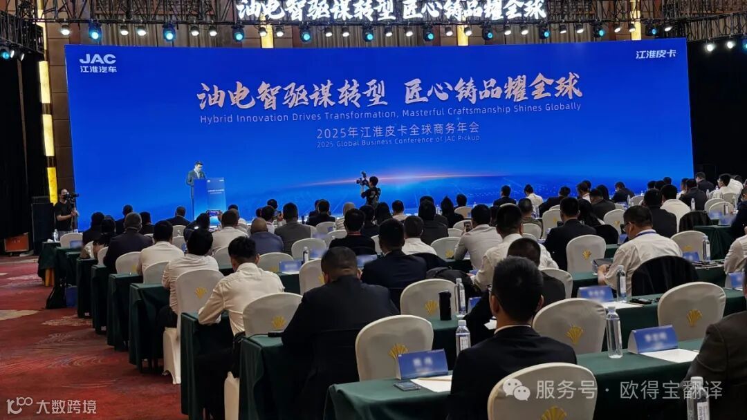 4月21日,江汽集团"油电智驱谋转型·匠心铸品耀全球"全球商务年会在合肥盛大启幕。欧得宝翻译作为官方指定语言服务商,以中英双语同传服务搭建跨文化对话桥梁,助力江汽集团高层与来自全球五大洲的300余位经销商伙伴、战略合作方共绘智能新能源时代发展蓝图。