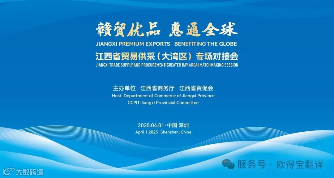 4月1日,由江西省商务厅、江西省贸促会联合主办的“赣贸优品 惠通全球”江西省贸易供采(大湾区)专场对接会在深圳隆重举行。欧得宝翻译携手山东汇博国际展览有限公司以专业语言服务为会议保驾护航,我们派出10人精英翻译团队,全程提供高质量英语翻译支持,助力跨境交流“零障碍”。