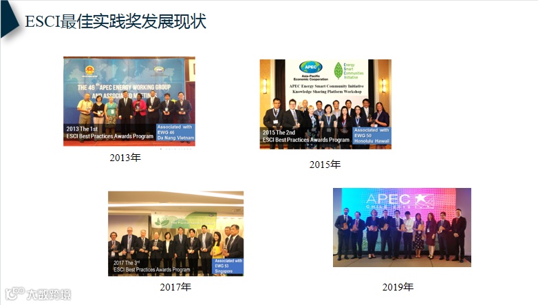 APEC ESCI最佳实践奖是目前APEC框架内唯一的项目奖项,由能源工作组(Energy Working Group,EWG)落实。ESCI全称能源智慧社区,Energy Smart Community Initiative,最佳实践奖包括智慧交通、智慧建筑、智能电网、智慧工作和低碳示范城镇五个大类。