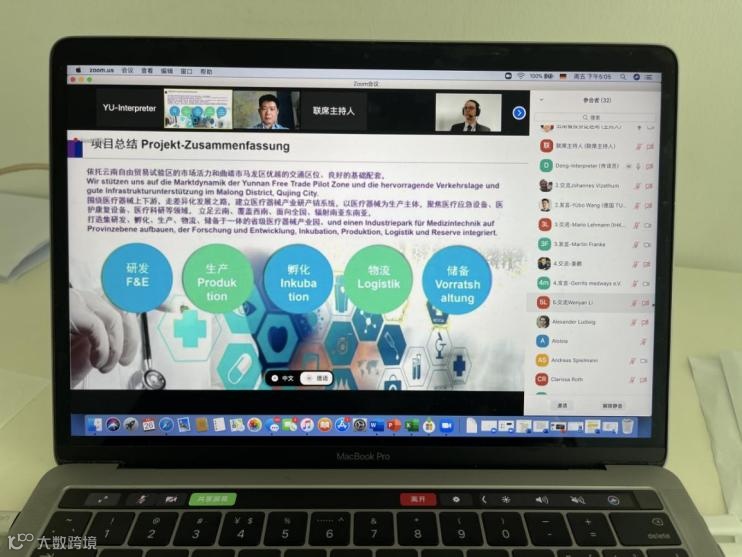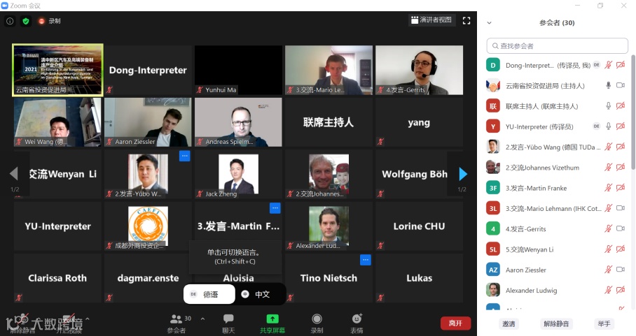 此次推介会以中德重点产业推荐为主题,云南省昆明市、曲靖市、红河州的招商部门以及德国客商以线上连线的方式参会。推荐会分别对昆明高新区重点项目、滇中新区汽车及高端装备制造产业、云南曲靖医疗器械产业、红河哈尼族彝族自治州的医疗、农业、电子设备等项目作出了详细介绍。