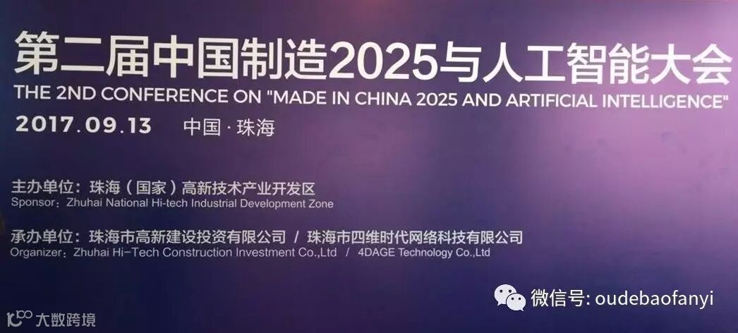 为深化推进“中国制造2025”与“德国工业4.0”对接,为两国合作打造新动能,促进中国人工智能和机械制造的发展,提升珠海市装备产业的“智造”水平、促进珠海市产业技术的提高,珠海(国家)高新技术产业开发区主办、珠海市四维时代网络科技有限公司、珠海市高新建设投资有限公司联合承办的“2017第二届中国制造2025与人工智能大会”于9月13日在珠海市度假村酒店举行。欧得宝翻译公司为本次会议提供同传翻译服务。
