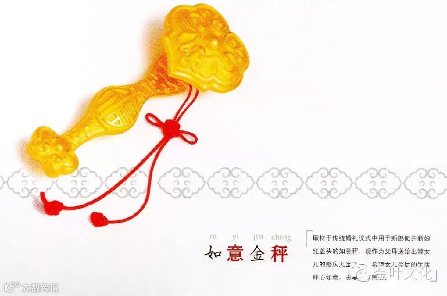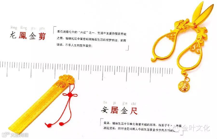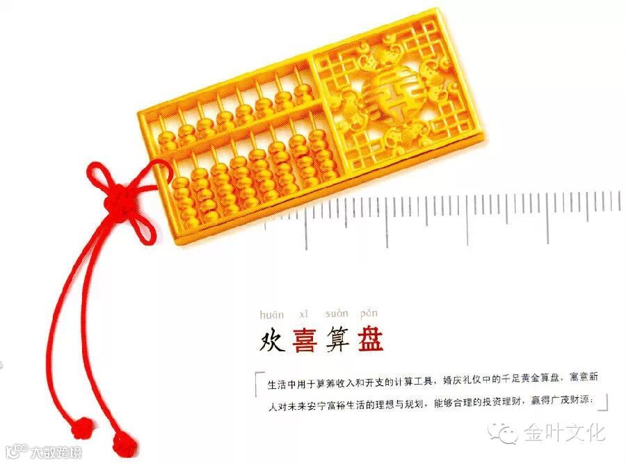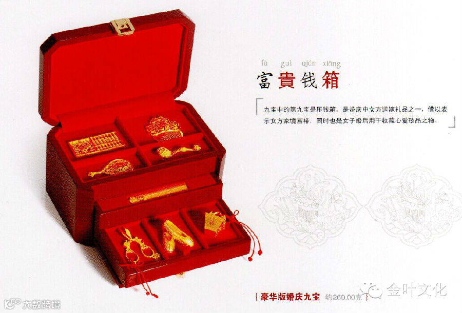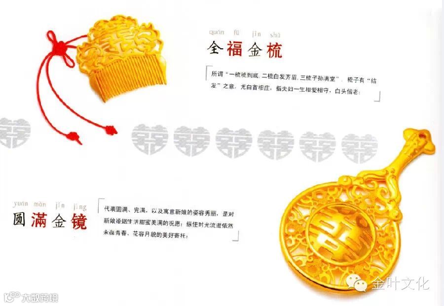金叶文化出品“婚庆九宝”结婚金饰,结合中国传统婚庆习俗与礼仪,从中国传统文化精髓中提炼出九个最具吉祥与喜庆寓意的物件,精巧的小配饰精雕细琢,故名“婚庆九宝”,取“长长久久”之意。