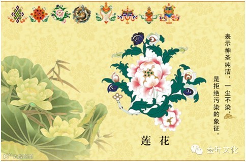 象征至清至纯的清净,代表纯洁心灵。莲花出污泥而不染,能使人们免於不净,并能带来种种的悦意。莲花代表佛的舌头,佛在说法时候流利顺畅,宛如金莲。就世间法而言,莲花象征着我们用柔善而纯洁的心灵去对待别人,容貌上就自然能焕发出发自内心的美,从而赢得别人的欣赏尊重和爱戴。