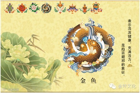 象征自由和超越,代表富裕和祥和。鱼行水中,畅通无碍,可透视混浊的泥水,故金鱼有慧眼之意。金鱼的眼睛象征佛眼,金鱼眼睛常开,就象佛时时刻刻照顾众生,永不舍离众生。世间法而言,她象征着我们可以洞察事物本质,有着超人的智慧,从而可以更自由自在的获得财富及自由。