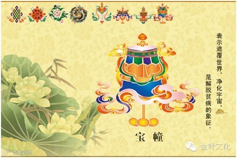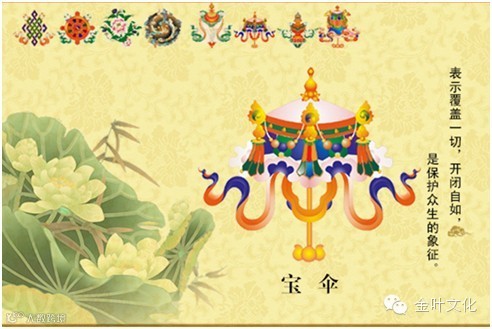 象征遮蔽魔障, 代表至上权威和保佑平安。宝伞喻为佛头。可以保护众生在轮回中不受烦恼、痛苦和障碍,帮助众生依止佛的法门来修持。就世间法而言,宝伞象征能掌握权威力量,德高望重,求官位得官位,权力稳固而平安.
