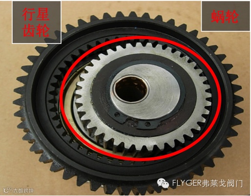 2)电动时,由电机带动大齿轮旋转,大齿轮通过行星齿轮减速后,由输出内齿轮带动阀门转动。大齿轮每转动一圈,输出内齿轮转动一齿,实现较大的减速比。蜗轮内齿轮与输出内齿轮齿数相差一齿,蜗轮不会跟随大齿轮旋转。故在电动时,手轮保持静止。
