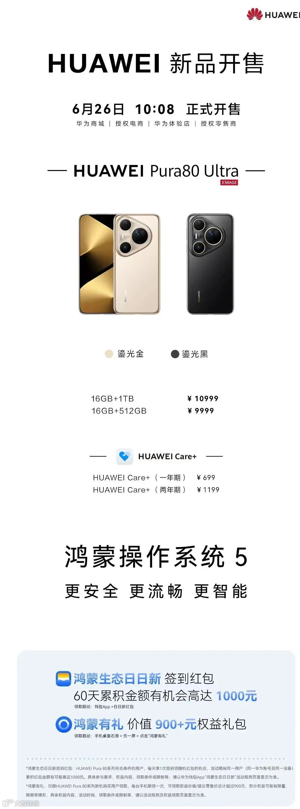 华为 Pura 80 Ultra 已正式开售,现在下单,还有超多福利等你来拿!数量有限,先到先得哦!