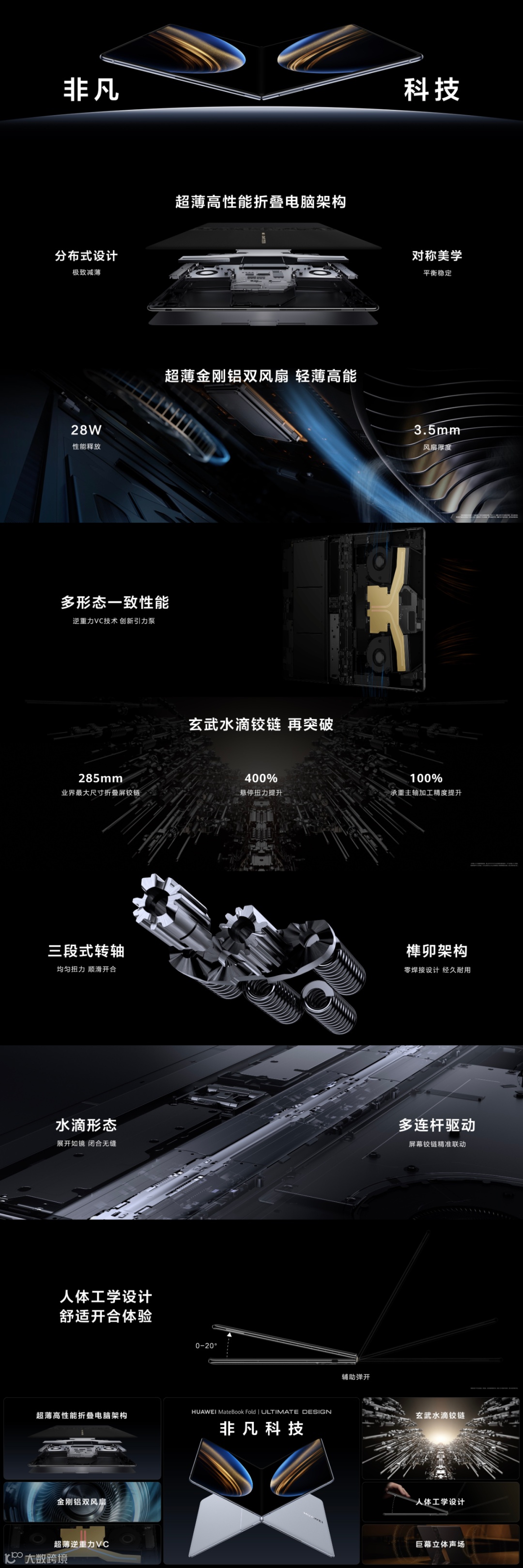 非凡科技,极致工艺。华为MateBook Fold 非凡大师,采用全球最大尺寸玄武水滴铰链;三段式转轴搭配榫卯结构,超稳固超耐用。