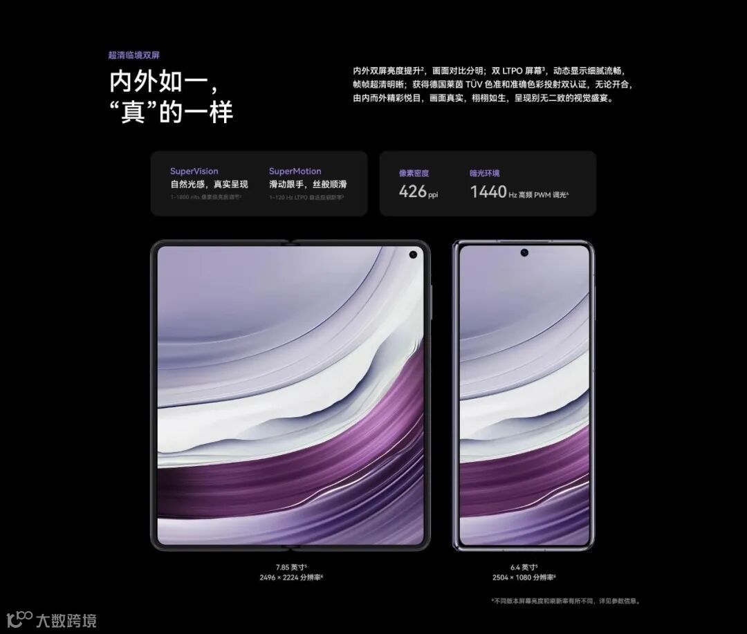 外屏为6.4英寸LTPO OLED,支持1-120Hz自适应刷新率;内屏展开后达7.85英寸,分辨率2496×2224,峰值亮度1800nit,配合超低反射镀膜,阳光下清晰度提升50%。双屏均支持1440Hz高频PWM调光,护眼能力行业领先。
