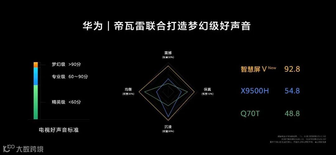 4、数据来源于华为实验室,75、85英寸的总得分为92.8分,65英寸的总得分为90.4分,55英寸总得分为68.8分。基于75英寸机型进行对比,其他尺寸对比略有不同,请以实际为准。