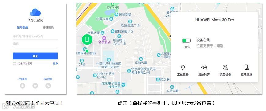 2. 找不到手机时,借助其他华为手机登录查找我的手机APP,或使用电脑、平板、手机等设备登录华为云空间官网,选择你要查找的设备然后定位设备;