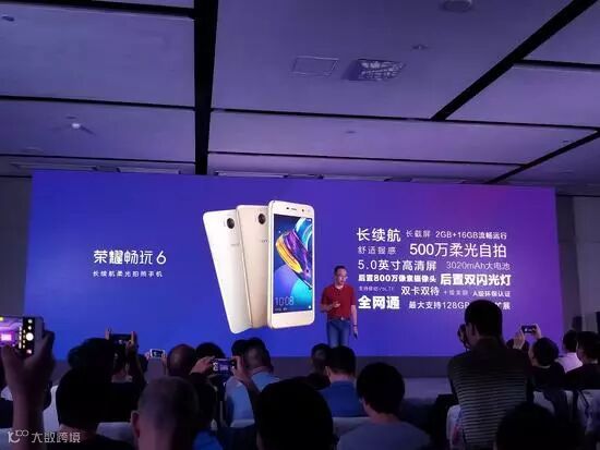 而本次除荣耀V9 Play外,本次荣耀还带来了全新的长续航前置柔光自拍手机---荣耀畅玩6,该机前置500W像素摄像头,拥有一块3020mAh的电池,其他配置上,荣耀畅玩6采用了一枚800W像素的后置摄像头、后置双闪光灯、拥有5.0英寸高清屏幕、最大支持128GB容量扩展等。