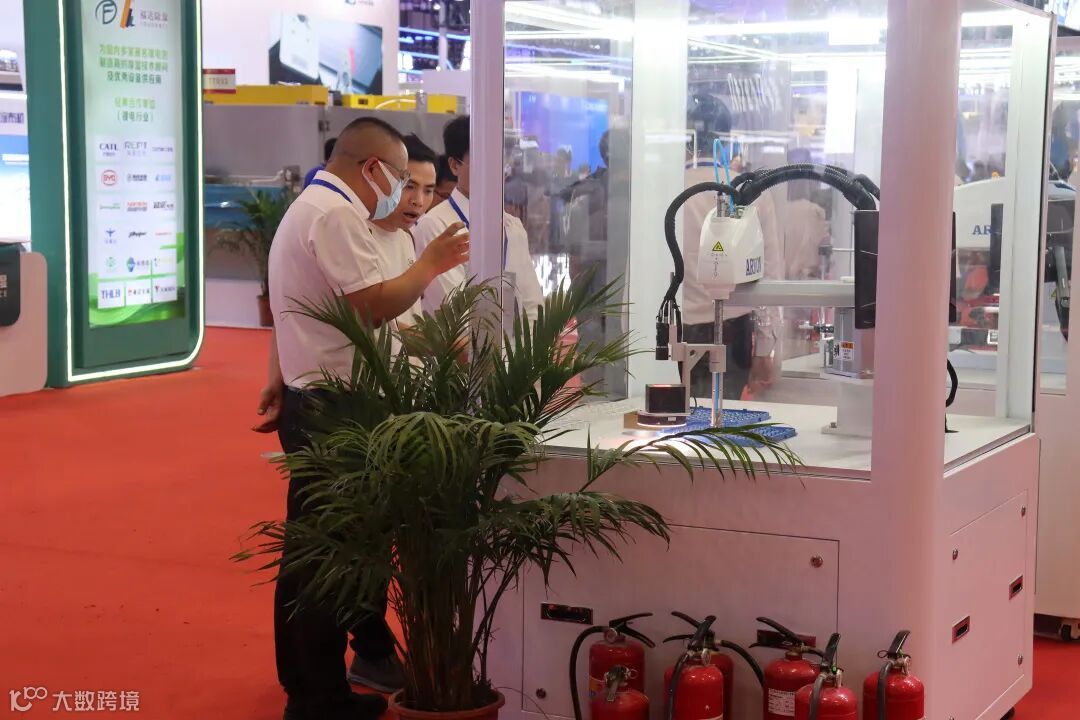 图为业务人员向客人介绍玮龙4轴机器人在拉带动态迫踪中场景的运用