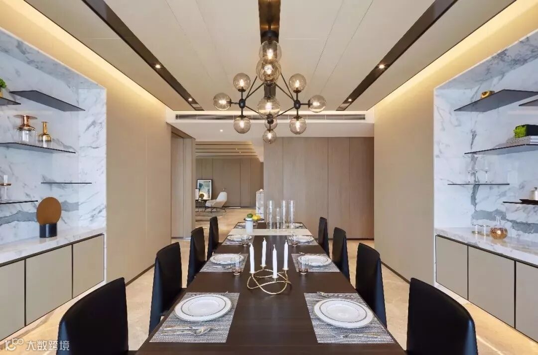 餐厅吊顶延续客厅手法产生视觉韵律。