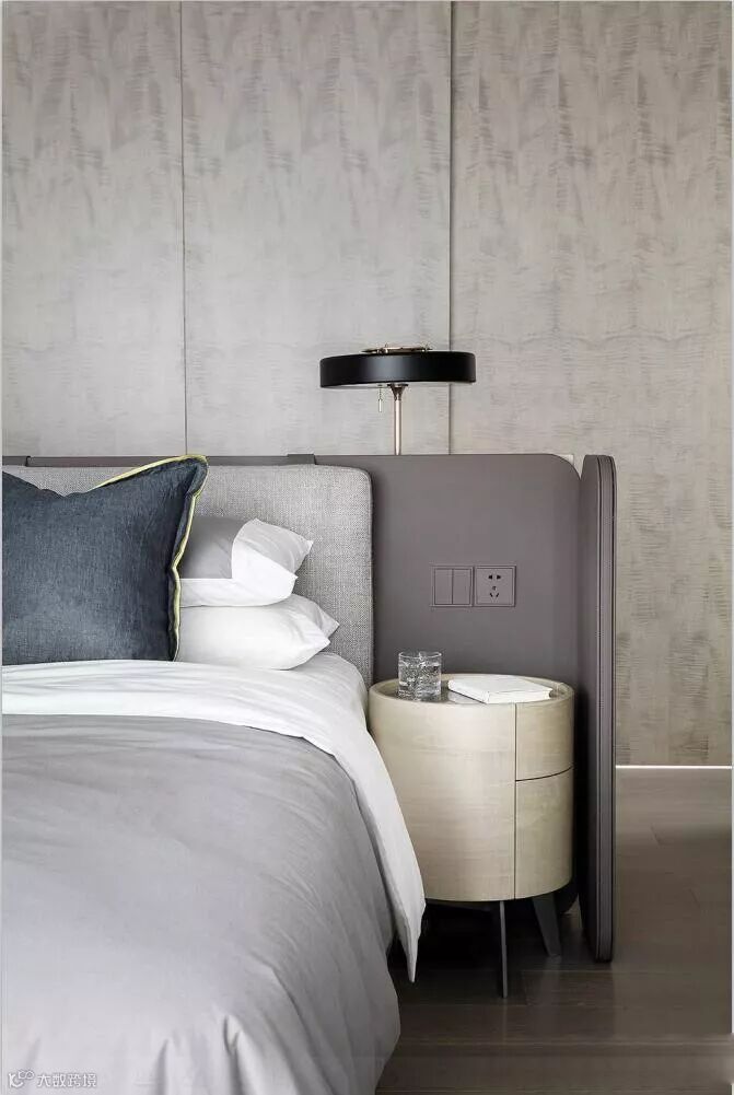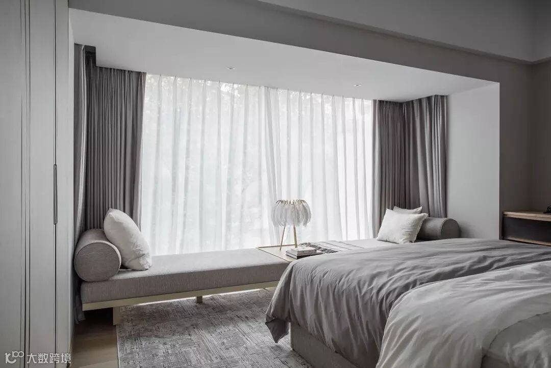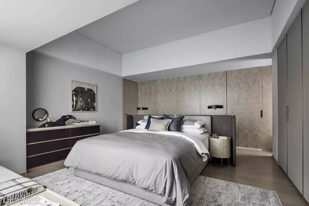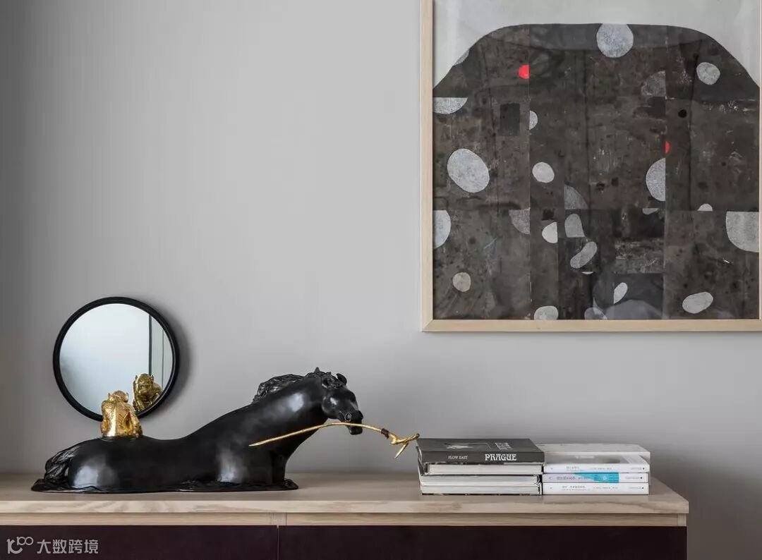 艺术家张姗的画作《方与圆》与刘辉的雕塑作品《静水徐清》是主卧重要的艺术点缀,在整体节制的灰色调的衬托下,凸显个性。
