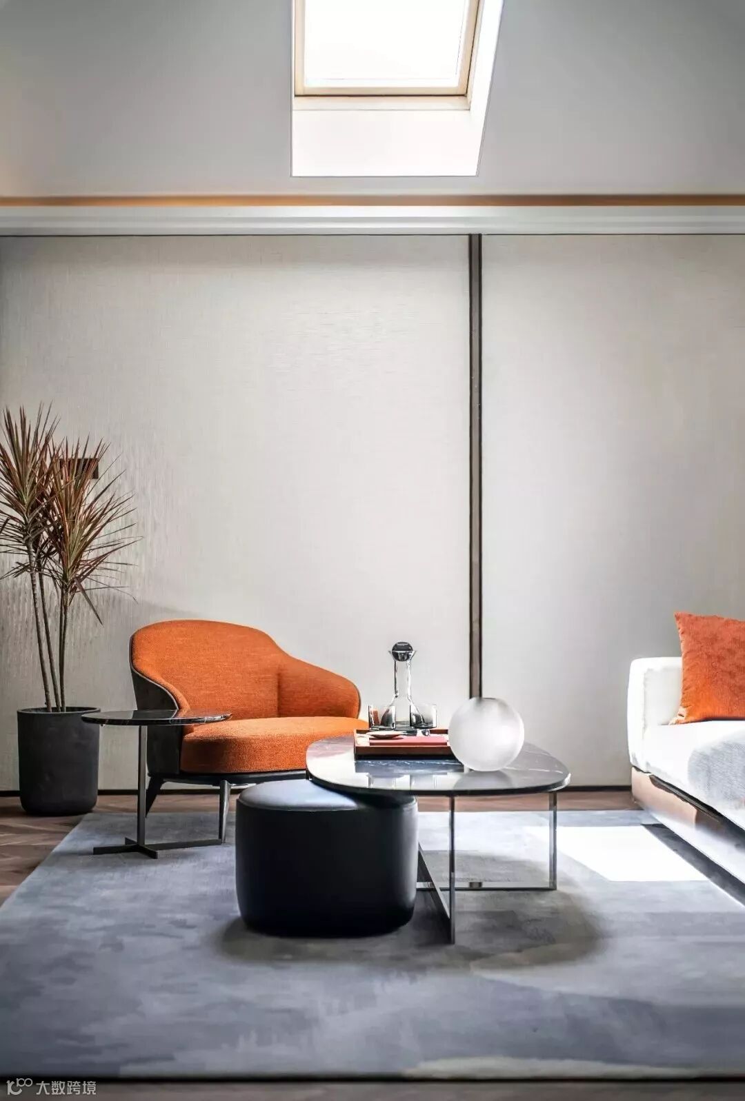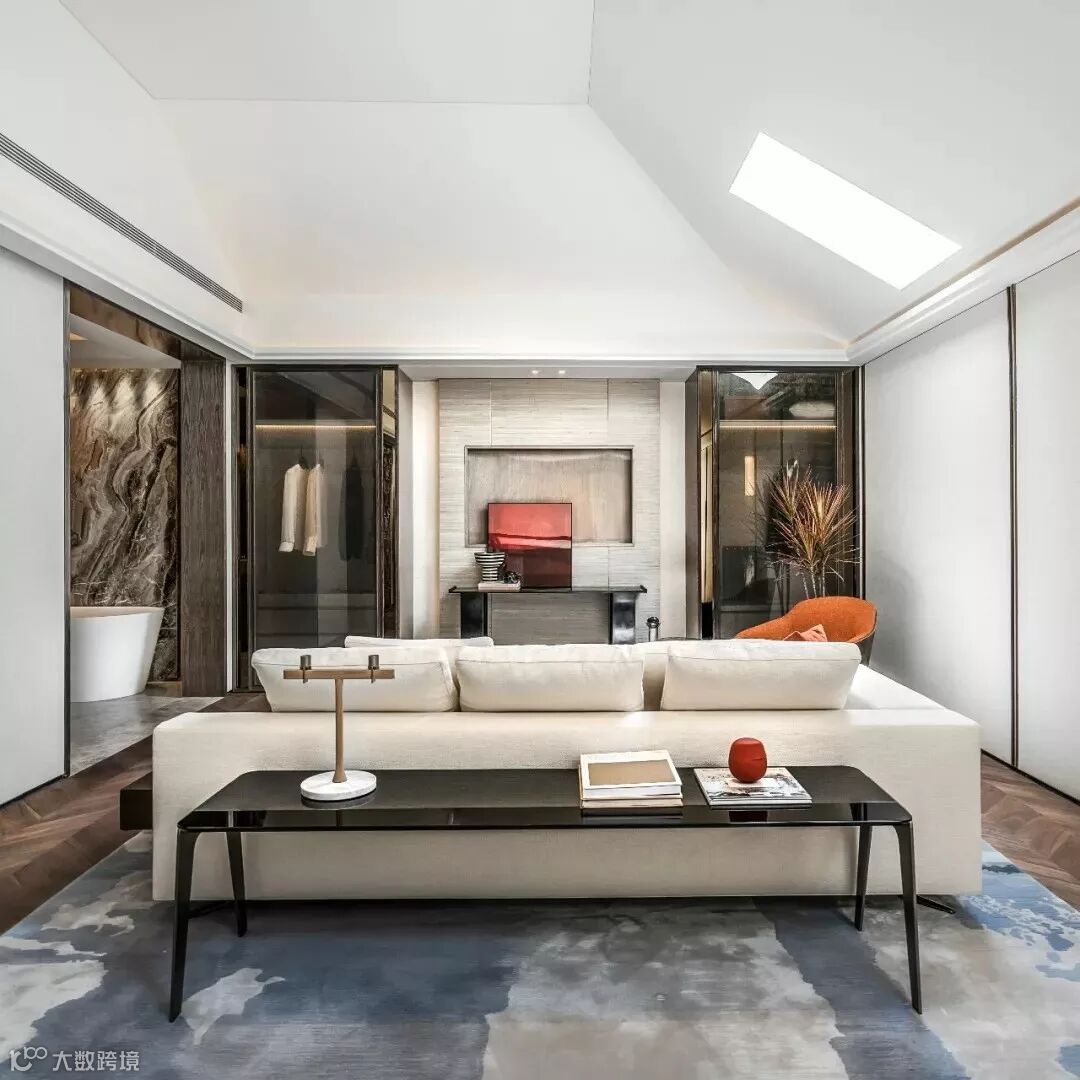 卧室、起居室、书房的多功能室内布局分割,有效地赋予这个开敞式空间不同的生活节奏。家具与空间相互渗透,为使用者服务之余亦是艺术品般的存在,构成了主人自成一体的空间秩序。生活的质感在一桌一椅之间透露。