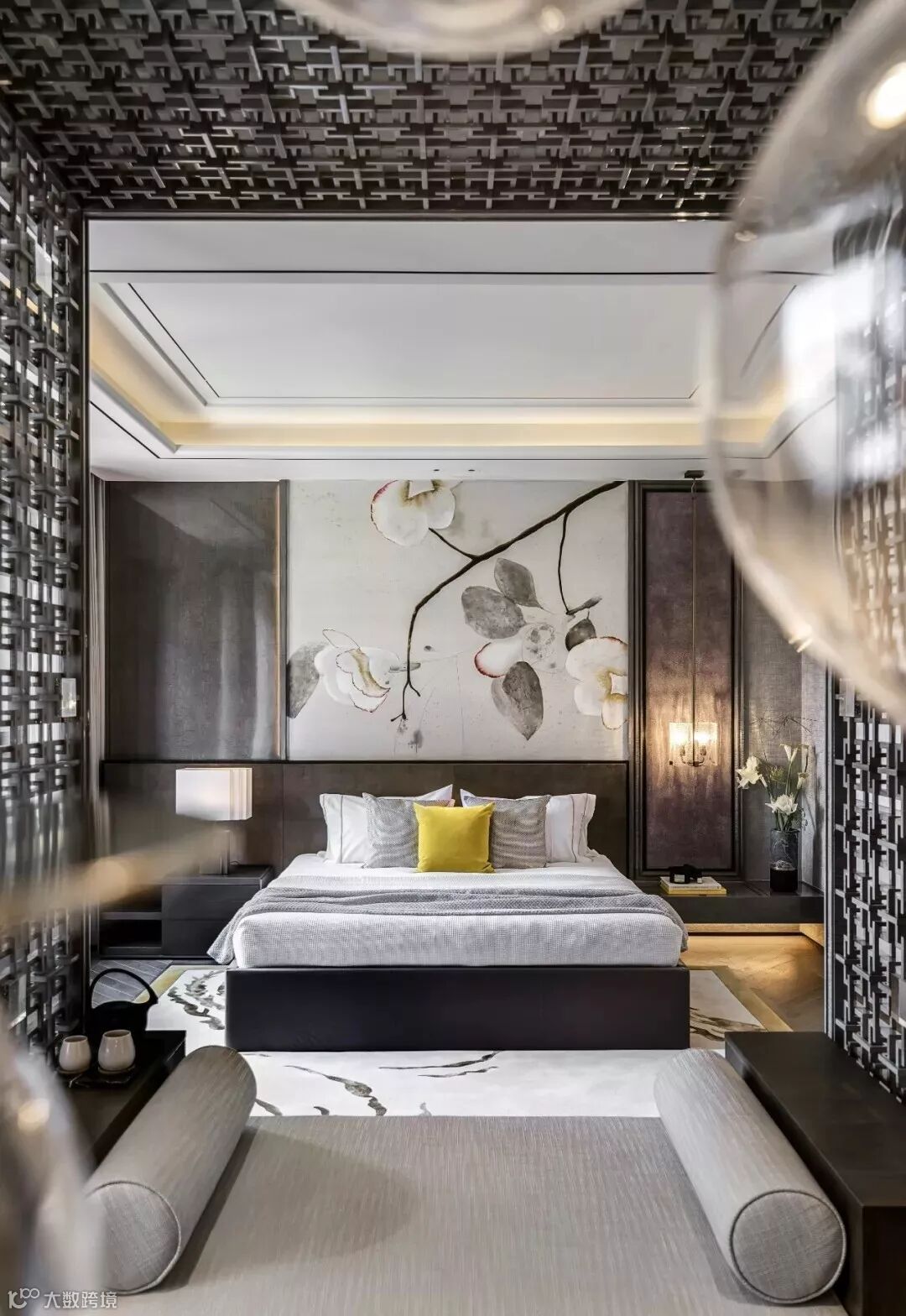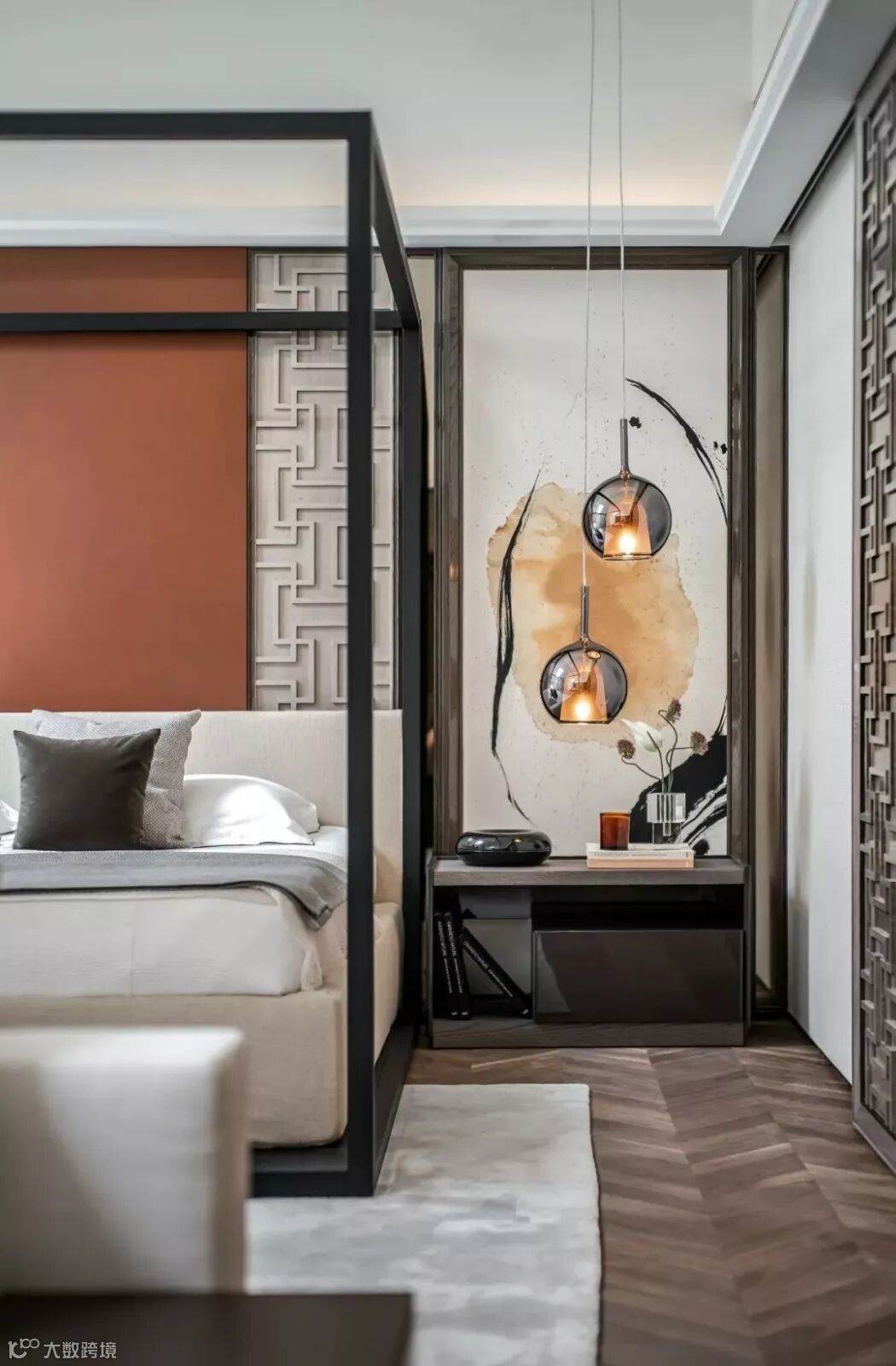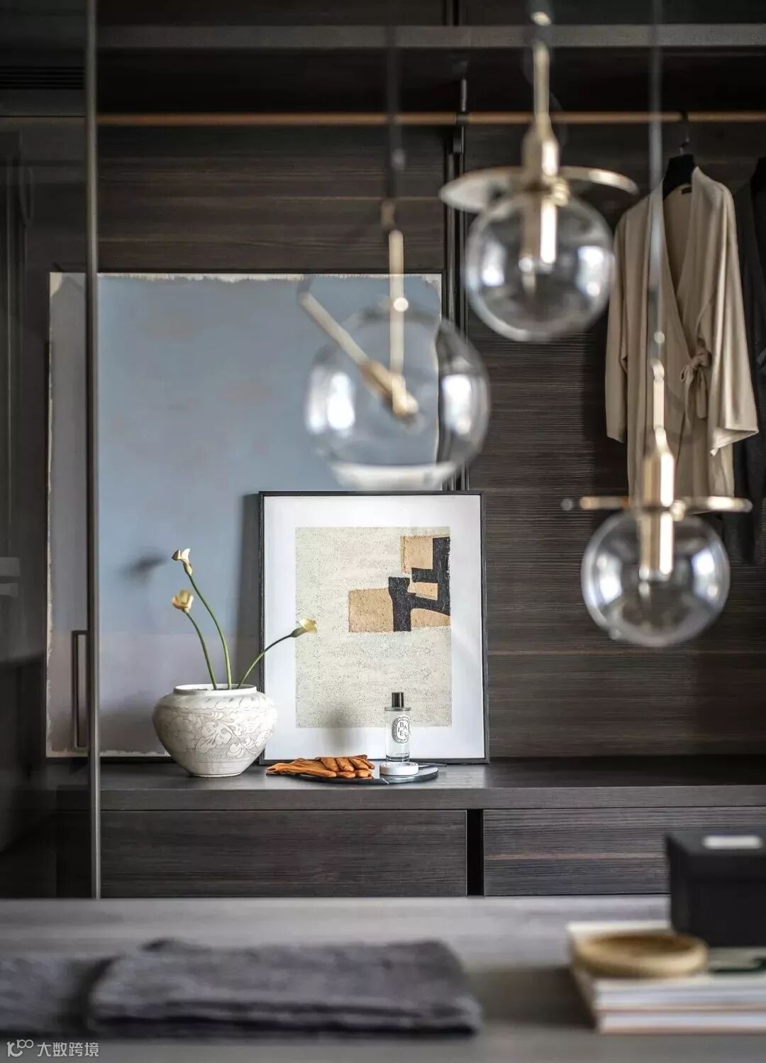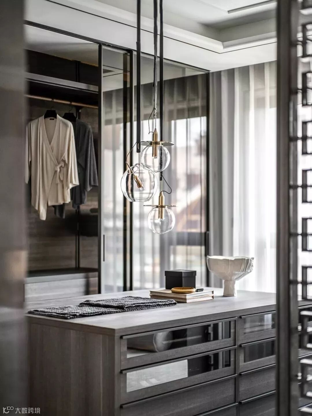 穿过格栅是步入式衣帽间,以沉着的灰色调主导的空间转向当代极简主义,垂坠至眼前的吊灯、满布褶皱的陶瓷花器与大地色泽的艺术画作颠覆了方才在卧室中营造的东方气息,两个空间风格迥异却在统一的色调间找到平衡。