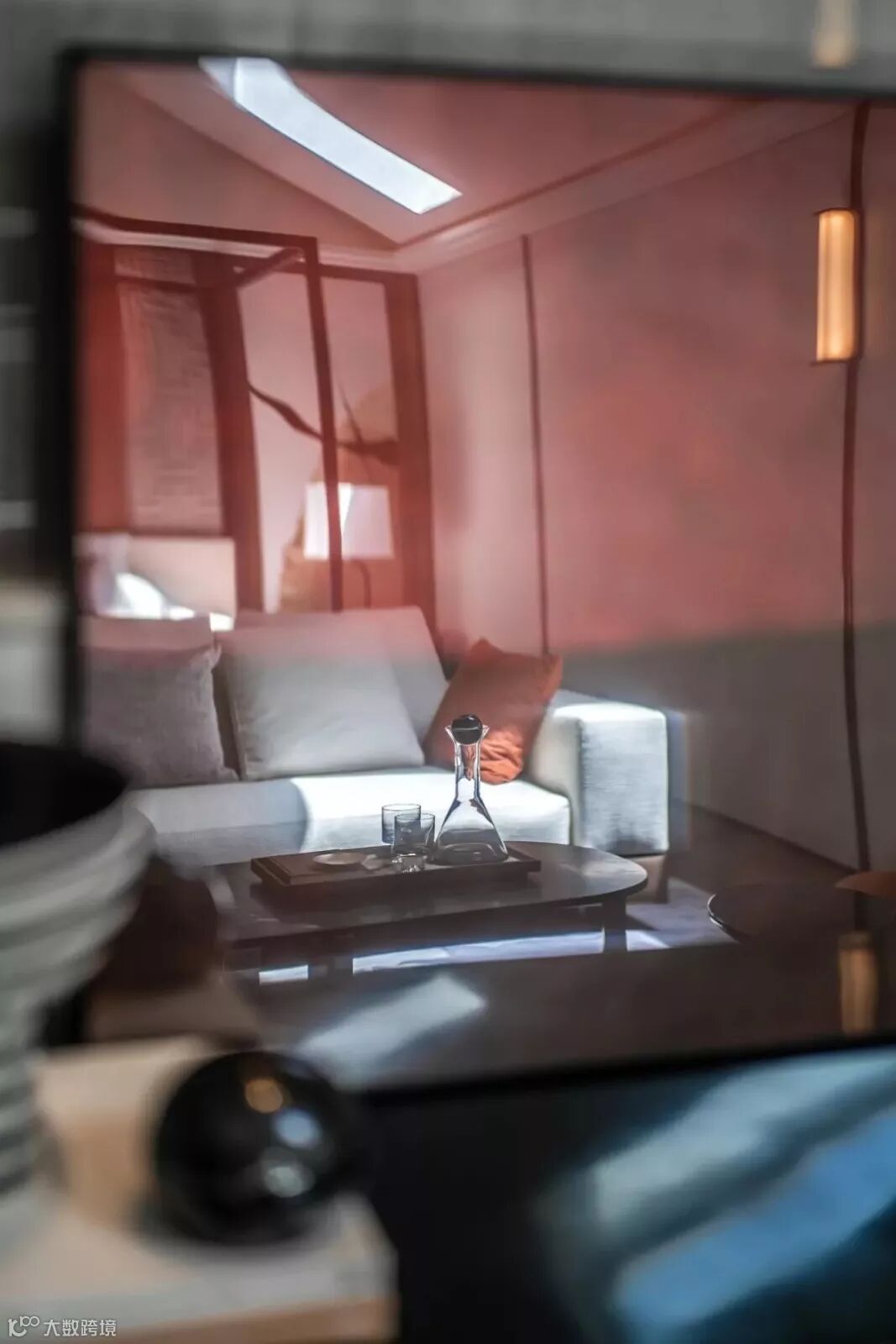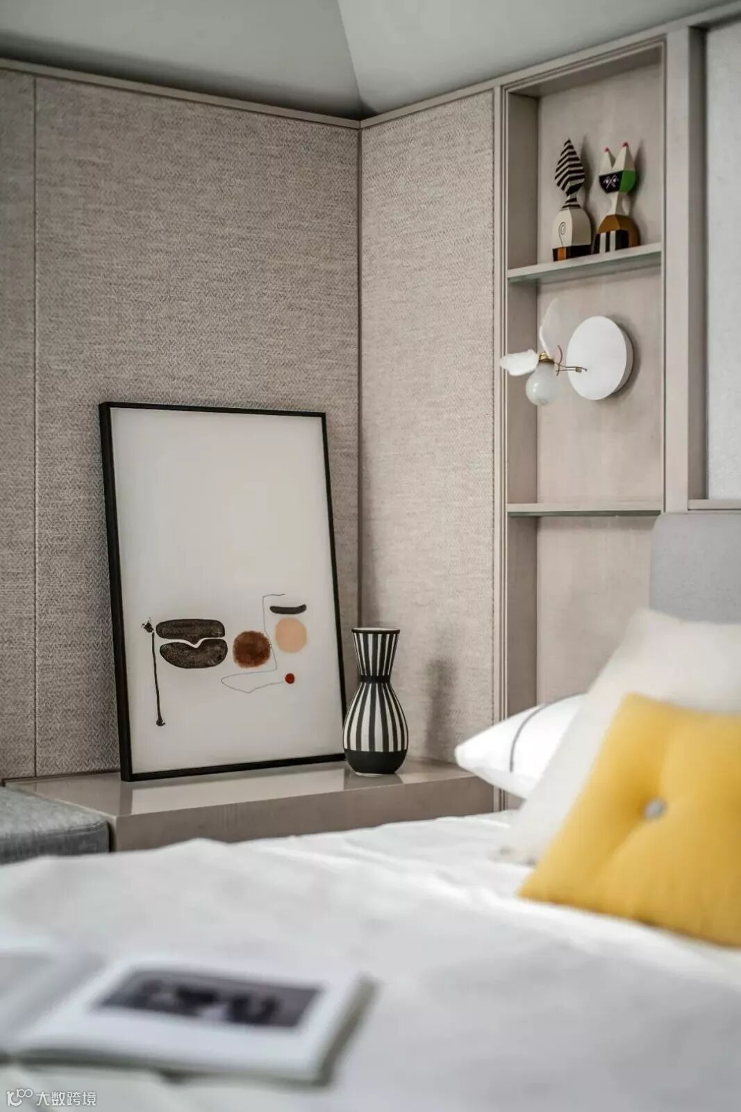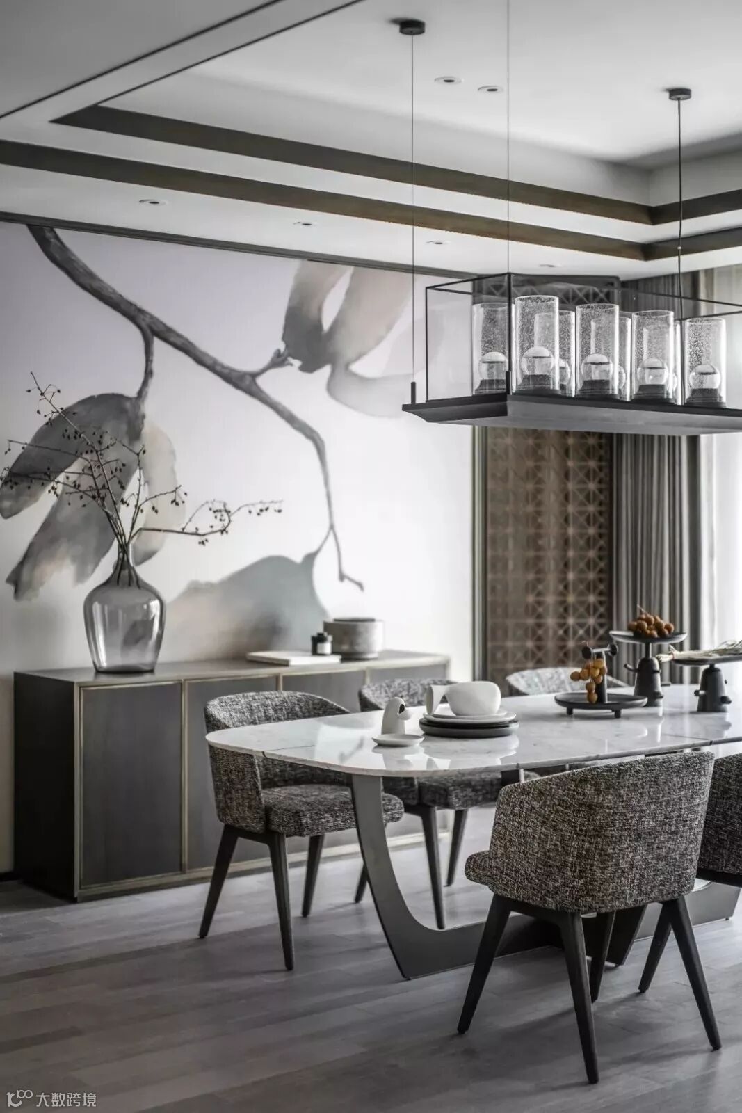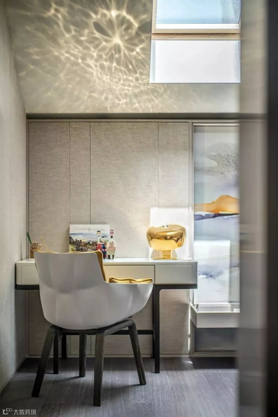 穿过格栅是步入式衣帽间,以沉着的灰色调主导的空间转向当代极简主义,垂坠至眼前的吊灯、满布褶皱的陶瓷花器与大地色泽的艺术画作颠覆了方才在卧室中营造的东方气息,两个空间风格迥异却在统一的色调间找到平衡。