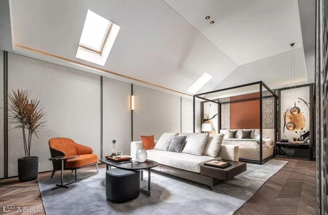 七层的挑高层卧室选用木质的框架床,既诠释东方的雅致诗意亦突显西方的流畅简练。