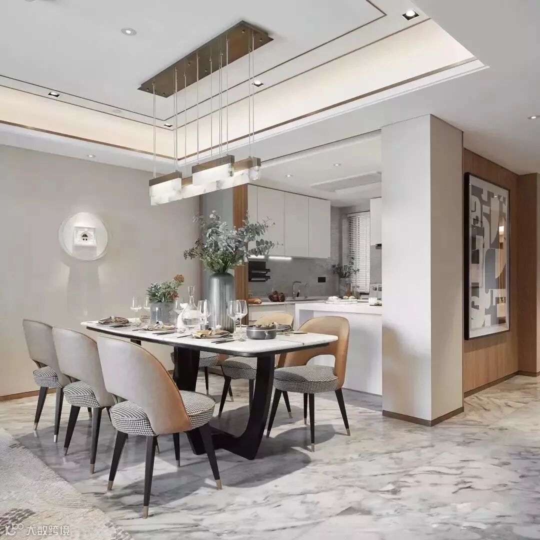 餐厅作为厨房与客厅的链接,在色调和材料的使用上,保持了空间的连贯性,同时,吊灯纹路与地面恰到好处的相呼应,变化中不失统一。