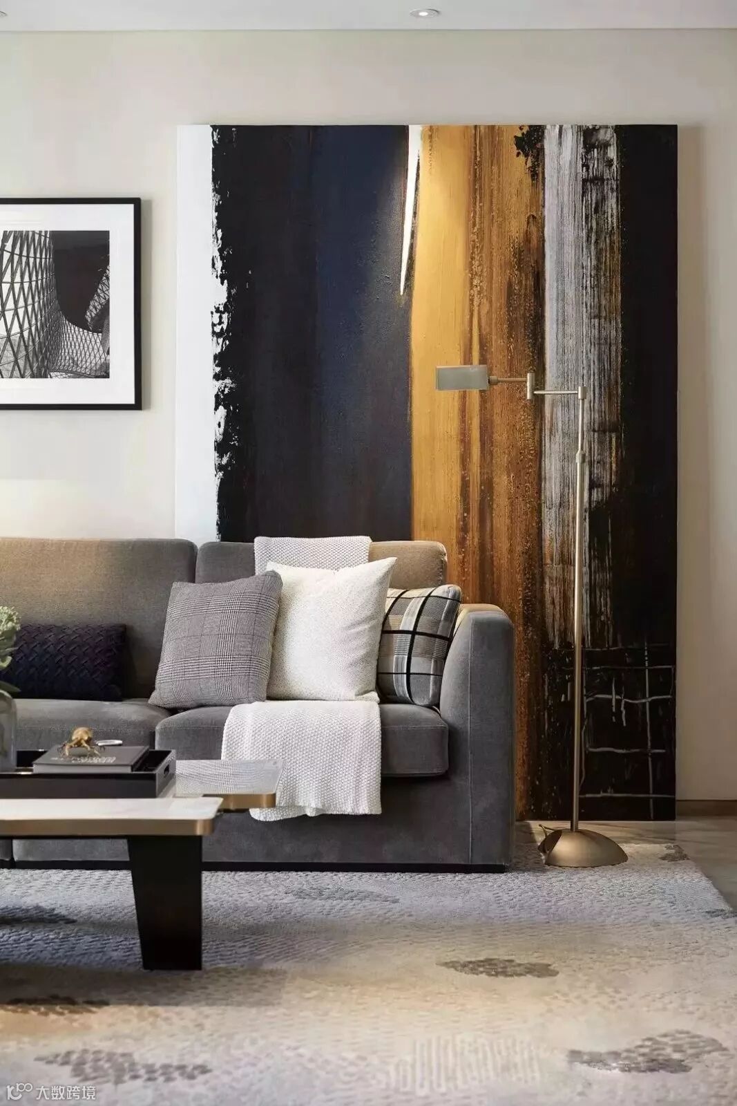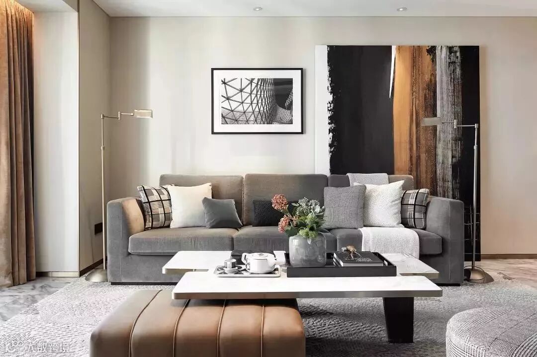 灰色的地毯纹络凹凸起伏,与沙发形成不同色阶的对比与延伸,线性落地台灯简洁有力,疏密有致,调节空间节奏感,进而使环境和谐有序。