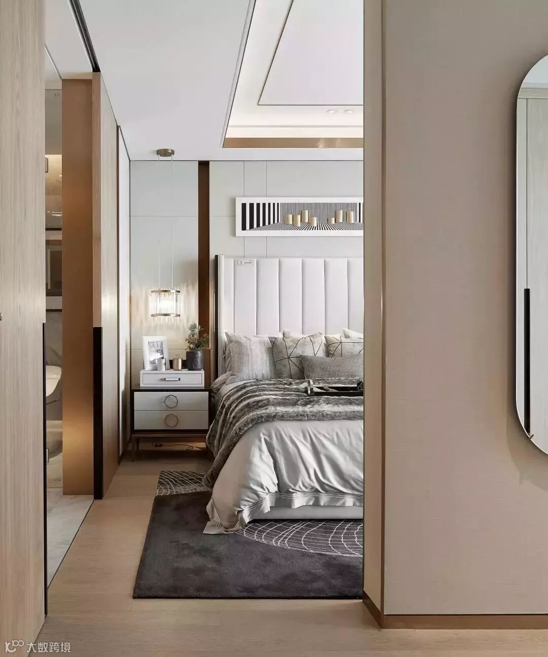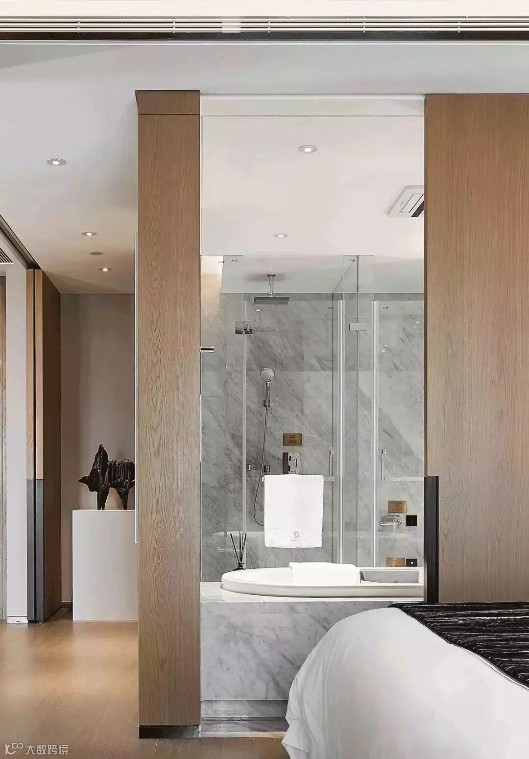 主卧室套房,左侧为开敞的开放式步入衣帽间,与卫生间连通,同时设置了隐藏式的木移门,可以把衣帽间关闭,保证了主人的私密。