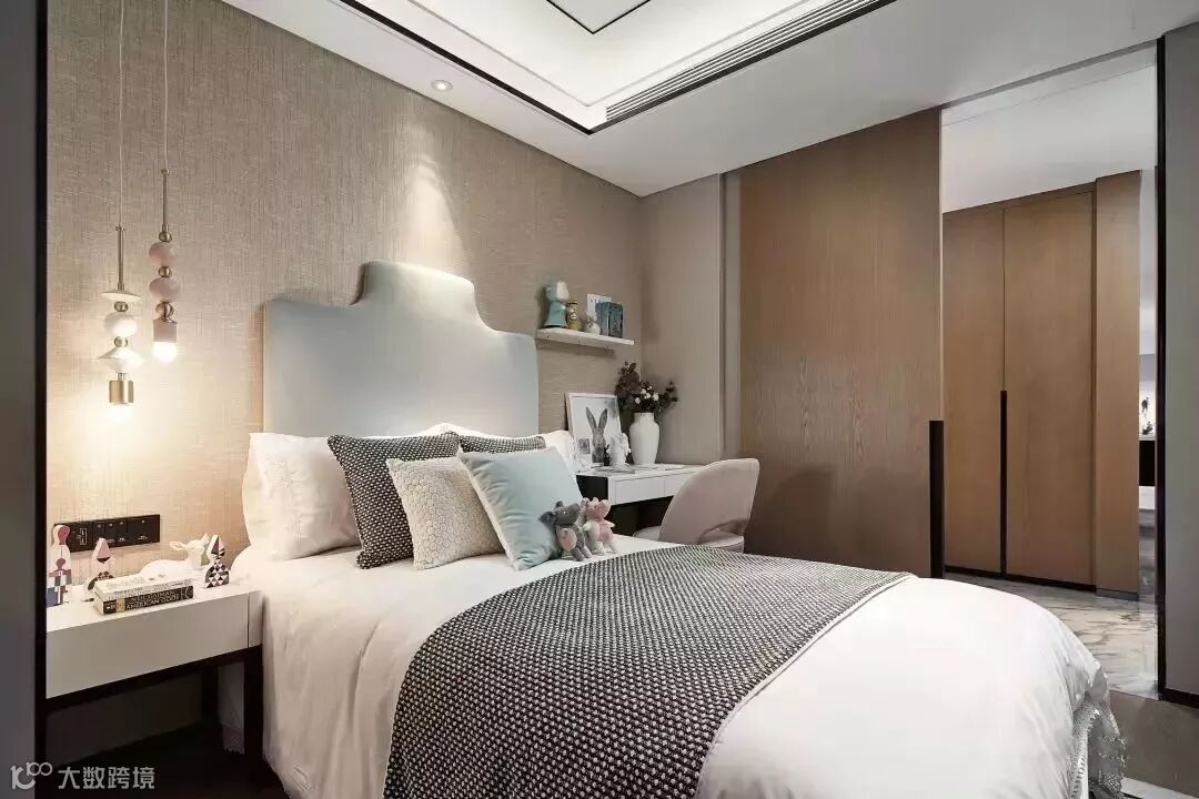 有人曾说,白色被阳光染黄后变成了米色。这个温暖惬意的说法与主卧的空间氛围完美契合。不同明度、纯度、色相组合使用,丰富空间层次,增加空间的细腻程度。