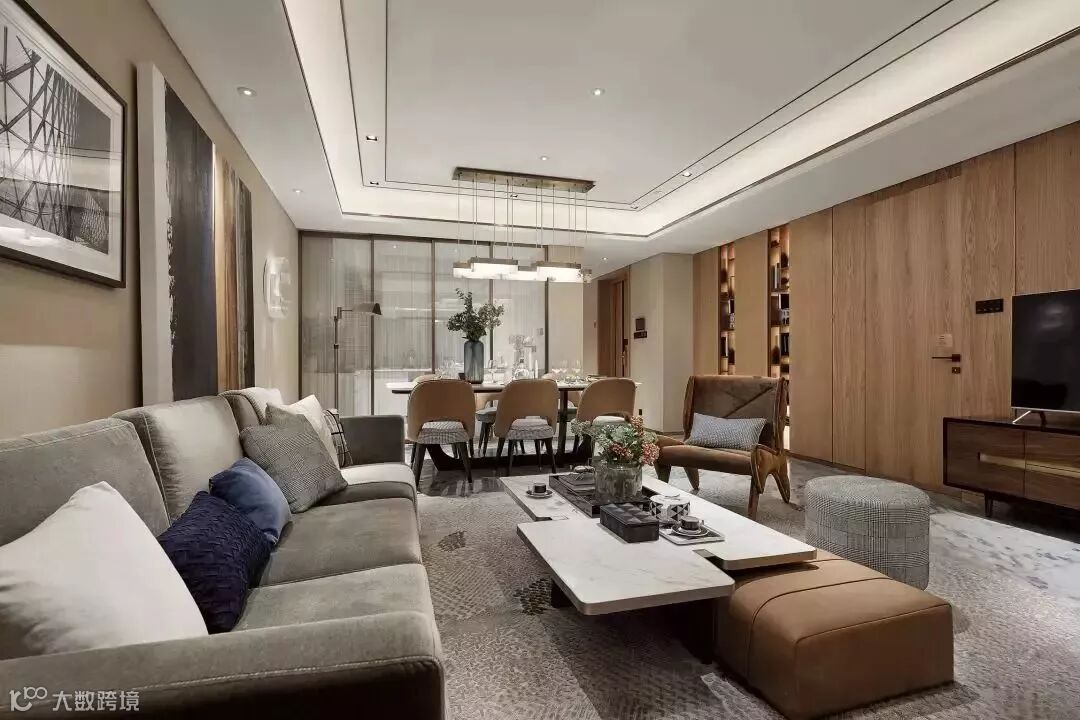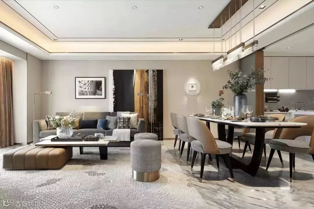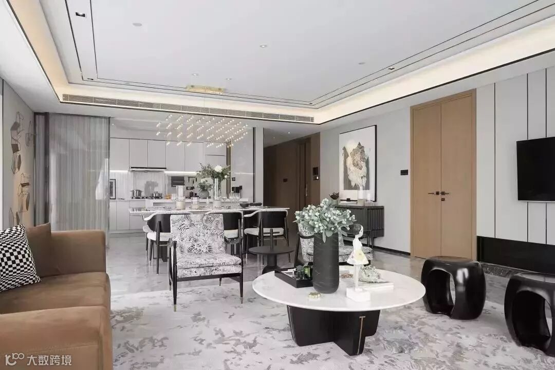 在客厅的设计上,突出“社交空间的理念”,尽量打破空间之间的隔断,使得整个区域可以成为主人与家人、好友零间隙交流和畅谈的社交场所。
