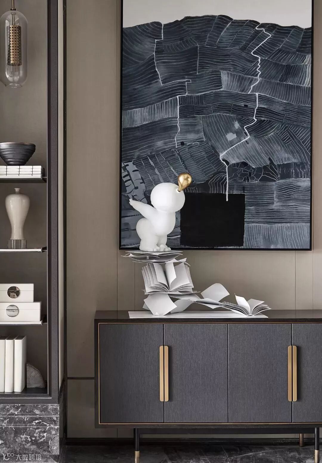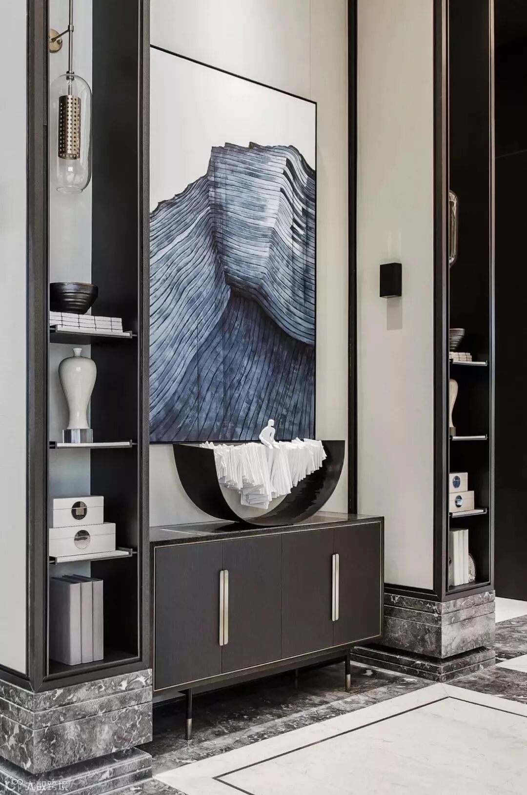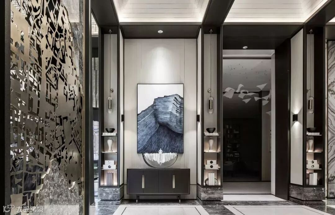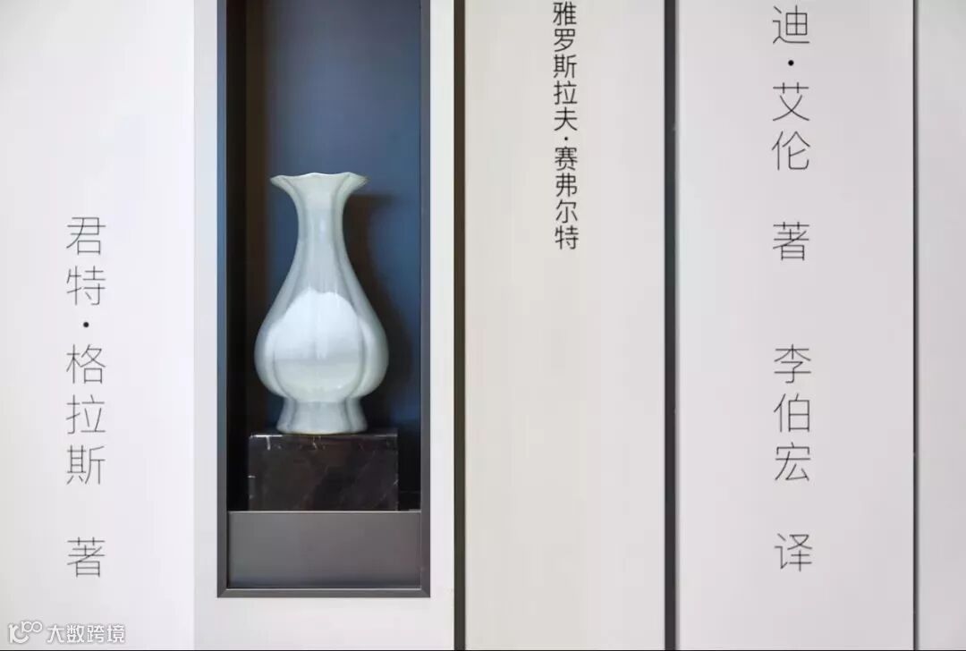 以博古架作为空间分割线,移步易景,有中式的山水写意,也有西式的抽象几何。