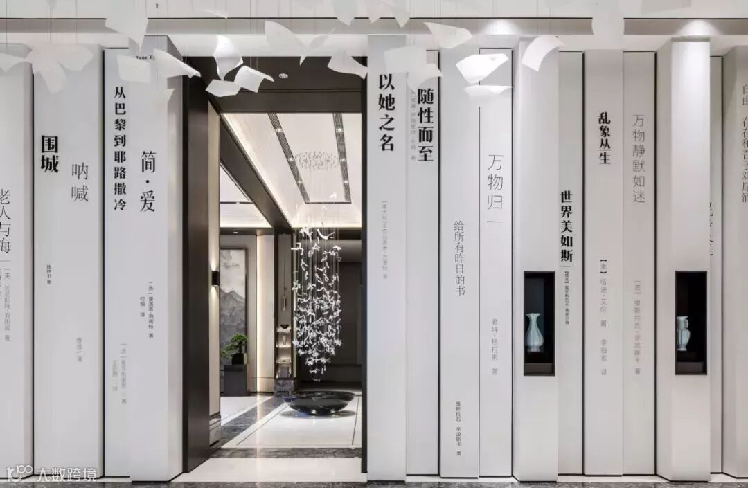 以书的厚薄高低无序排开,堆砌成墙体,有中式的无声《呐喊》,也有西式的“静默如迷”,纸张纷飞,笔划垂如丝绦。