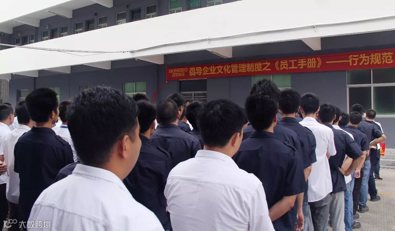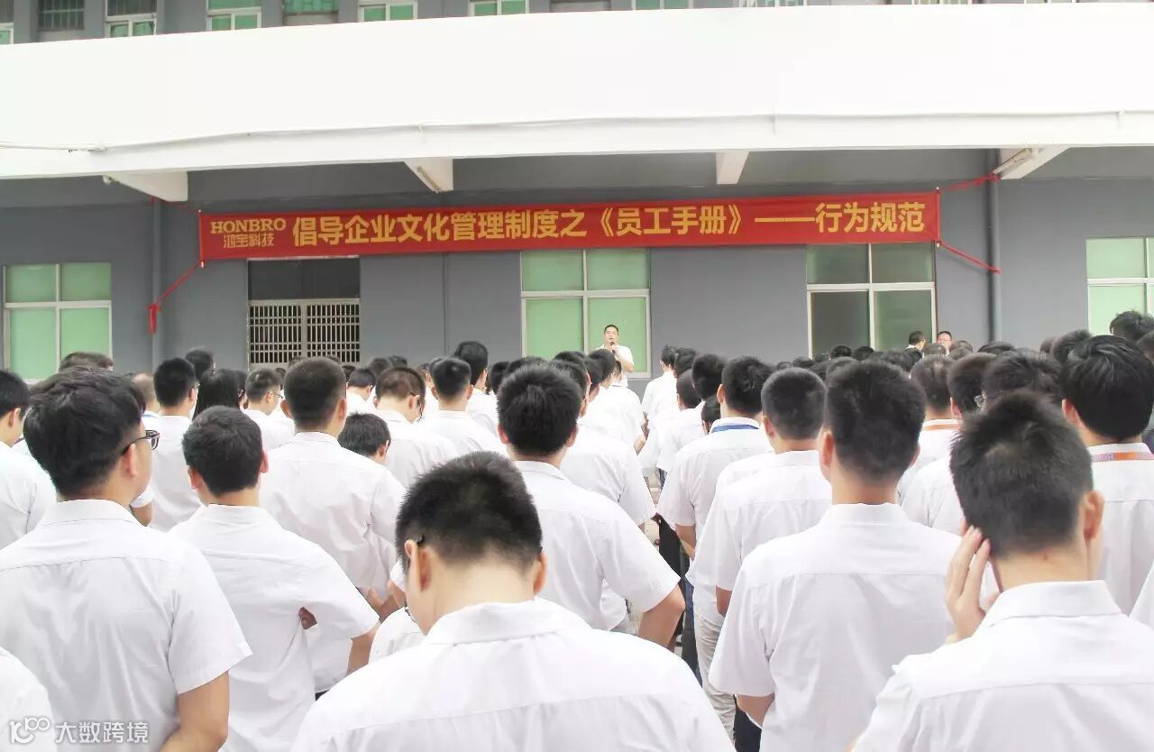 唱完鸿宝纪律歌,接着宣读鸿宝宣言: 建设幸福企业,是企业可持续发展的客观要求,是企业作为社会公民的应尽责任,是建设和谐社会的重要内容, 在此,我们郑重宣言:坚持以客户为中心,为客户谋价值;贯彻以奋斗者为本,为员工谋幸福; 长期艰苦奋斗为纲,为股东谋回报;执行自我批判为戒,为企业谋成长;求是精神互敬共赢,为社会谋贡献。为实现行业第一品牌,成为一家受人尊敬的企业而努力奋斗!