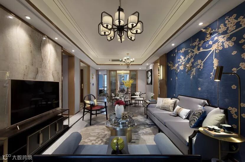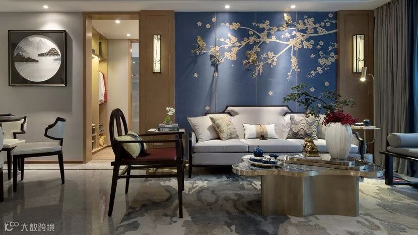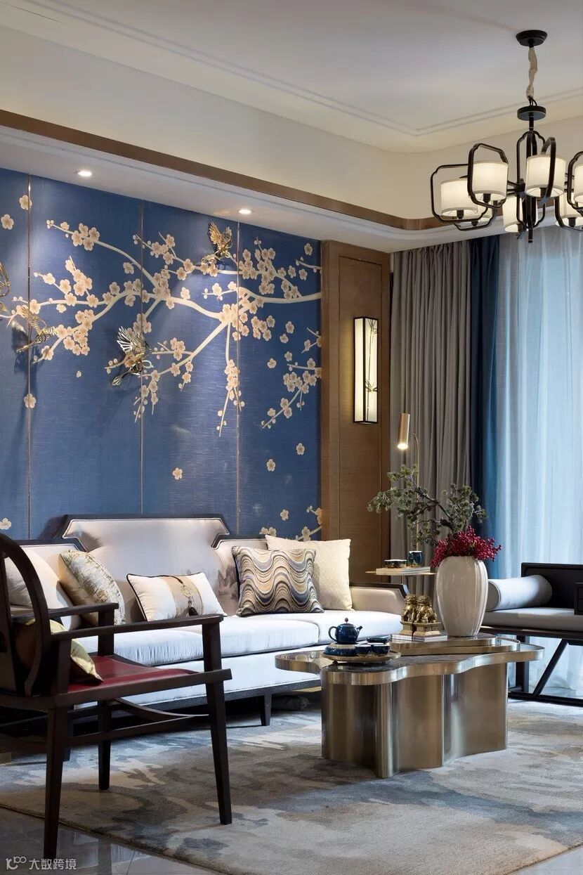 黛青色的点缀于空间随处可见,墙上朦胧的远山含蓄而委婉,而那留白之处泛着清幽的灯光,更是给予人们无尽的想象。