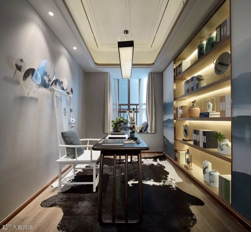 泼墨浸染的地毯铺于木地板上,黑白之间蔓延几分自由写意,书卷文物的香气弥漫在书房的每一个角落,静静品味这清闲雅致的独处时光。