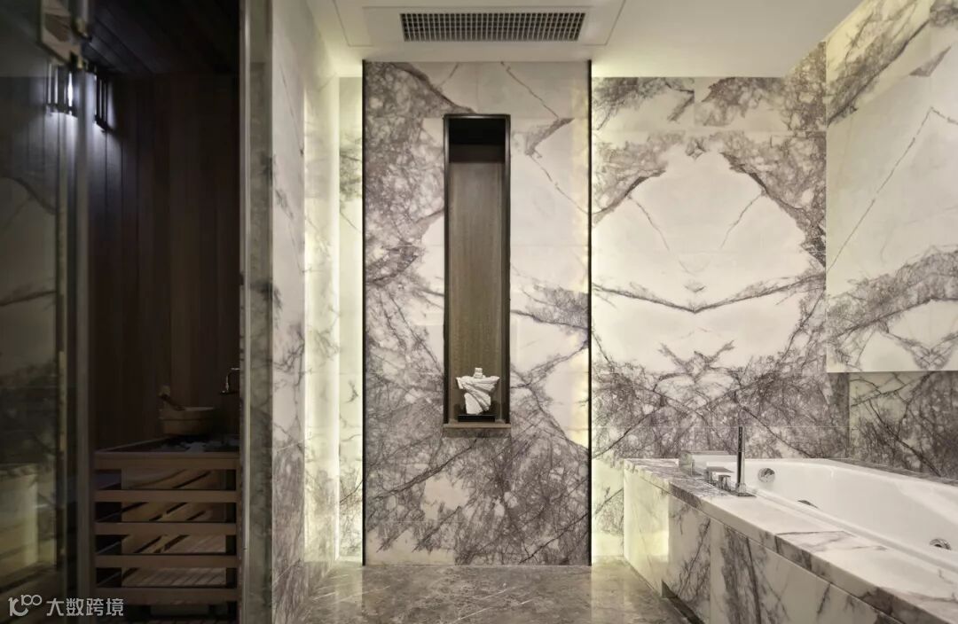 主卫以自然、质感呈现为主要法则,墙身采用冰玉石材,纹理如水墨般自然延展,日光透过竖向格栅,营造出无限的意境氛围感。
