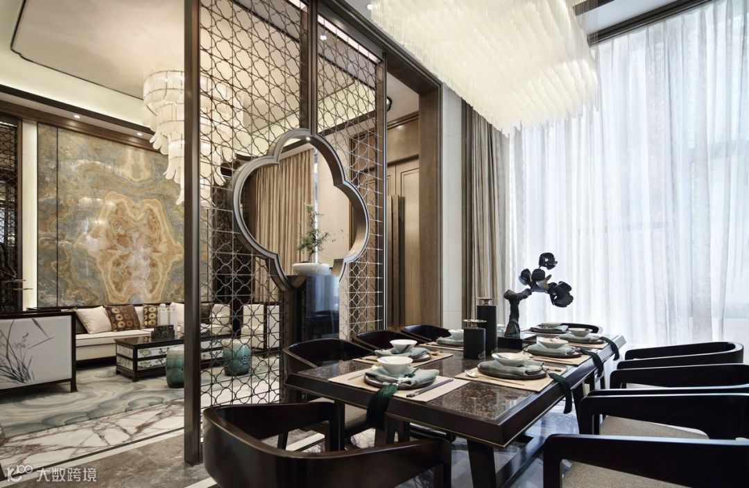 客厅空间运用海棠花造景屏风一分为二,营造隔而不断的空间效果。中式屏风的雅致,配合软硬结合的金属感线条,极富质感的餐椅和特色纹案的地板,让整个餐厅仪式感中不乏轻松和舒适。