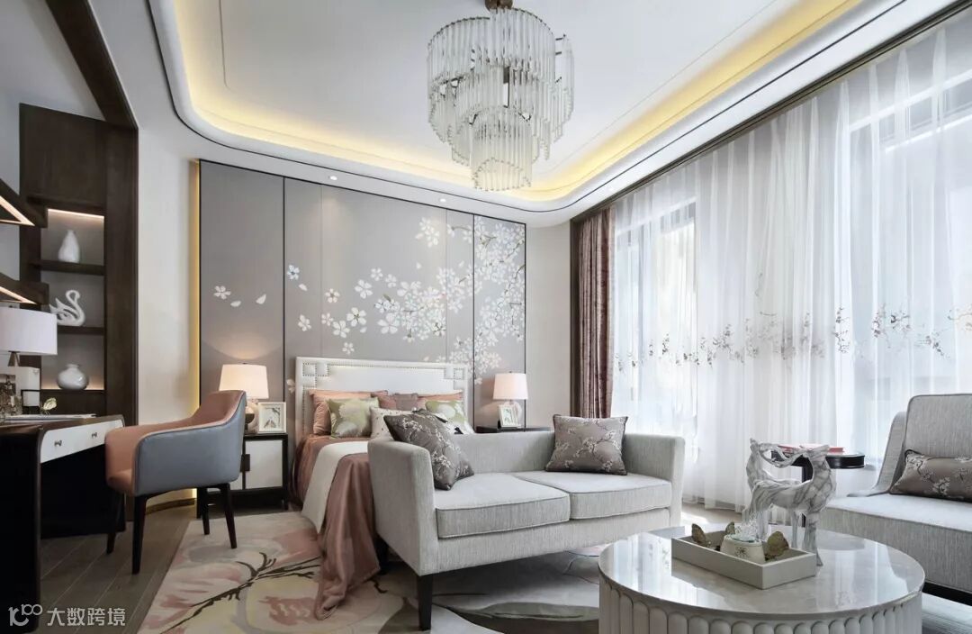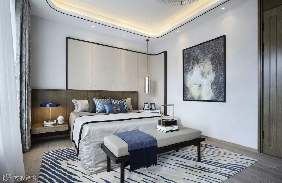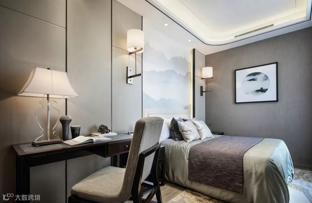 古韵新意,美境相连。主卧结合墙身硬包、天花嵌入的古铜不锈钢、艺术玻璃、皮雕和布艺,绝佳视觉美的背后其实是对设计师和施工团队的严苛高要求。