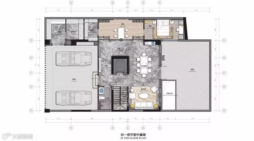 地下二层环绕式的流线设计,进入后呈现开放式的视觉感受,综合影音室、品酒区、酒窖等功能,按属性划分功能空间及动静分区。