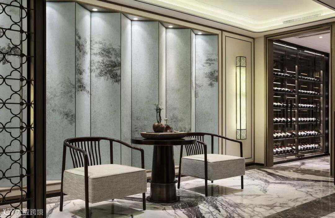 品酒区走廊采用现代屏风的形体在墙体大面积铺展,提取山水元素,通过空间的营造,体现主人典雅质朴、大方端庄的审美趣味。