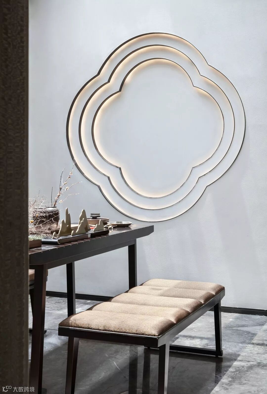 在插花区的空间里,设计师利用建筑天井为空间创造的通透气质,墙面采用海棠花叠级,与庭院氛围自然融合。