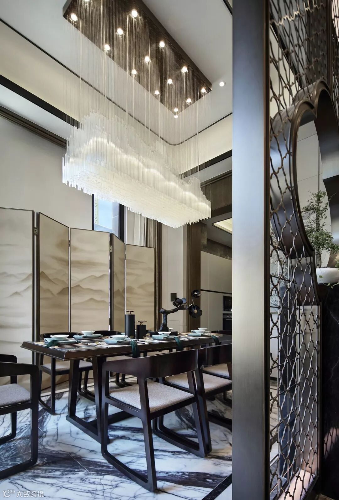 中式屏风的雅致,配合软硬结合的金属感线条,极富质感的餐椅和特色纹案的地板,让整个餐厅仪式感中不乏轻松和舒适。宁静舒雅 禅意悠长。