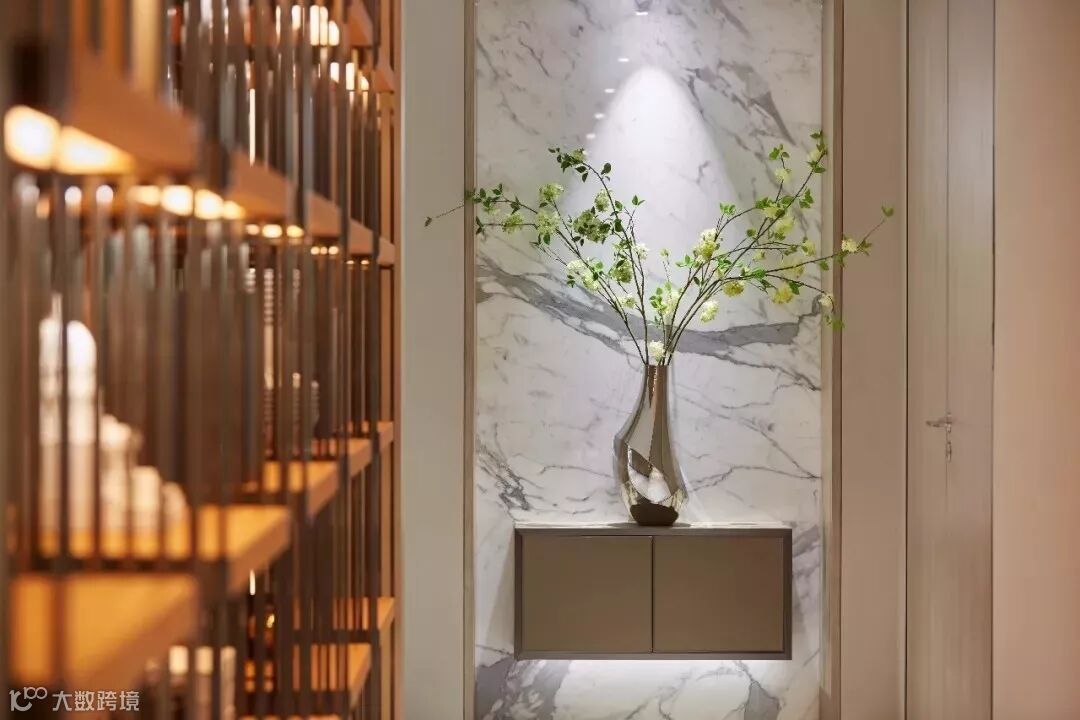 在狭长走廊引入展厅陈设概念,借由材质、光线、色泽进行分割,让视觉在体现规整之余,又提升收藏品陈列的观赏性。端口拐角处与餐厅置物区的背景元素强有力呼应。