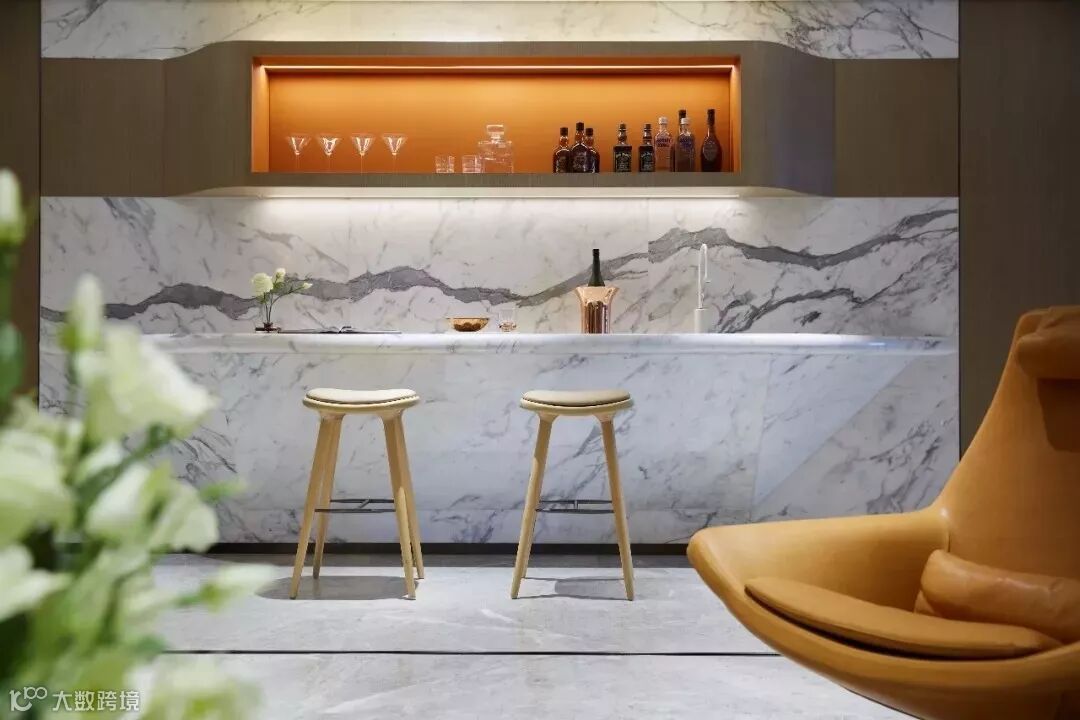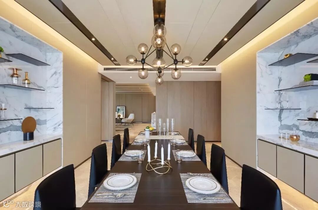 餐厅吊顶延续客厅手法产生视觉韵律。利用餐桌两侧立面非承重墙,打造内嵌式置物区,以金属钢板插入石材的形式错落分布,同时白色大理石背景与米色硬包、木饰面相辅相成。