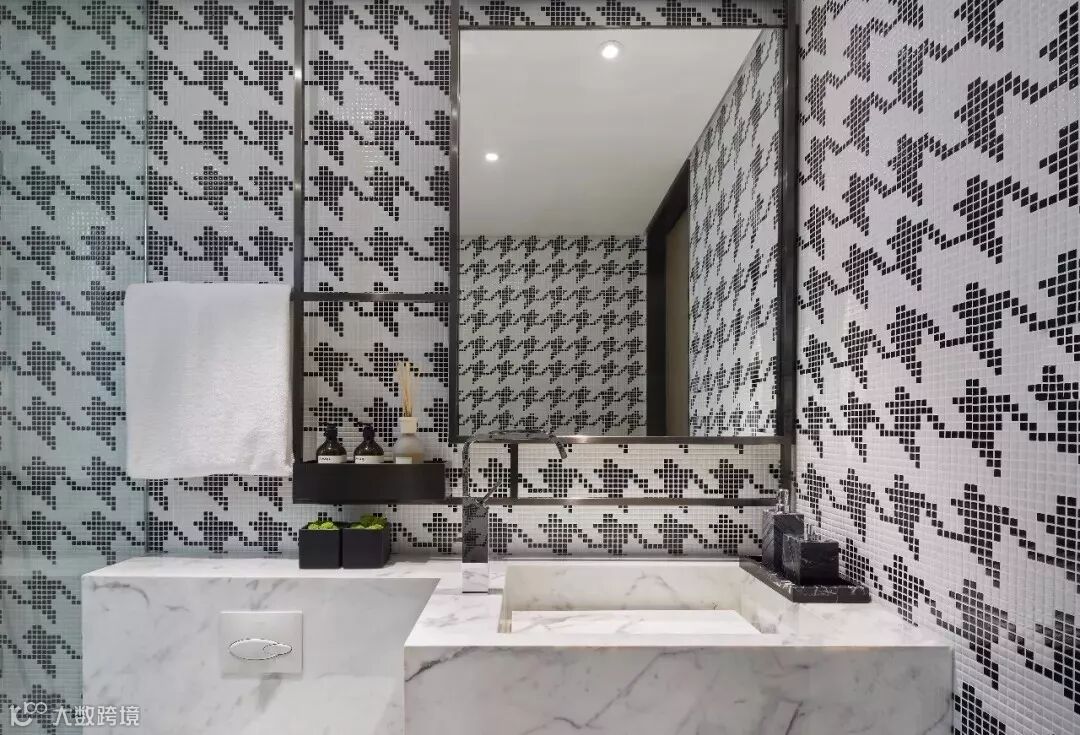 男孩房在垂直排序的壁布硬包下巧妙完成区域划分,亮色的点缀为空间带来欢愉与温馨。卫生间立面悬挂金属架,集镜面、置物于一体,搭配千鸟格纹饰背景,表达着前卫不羁。