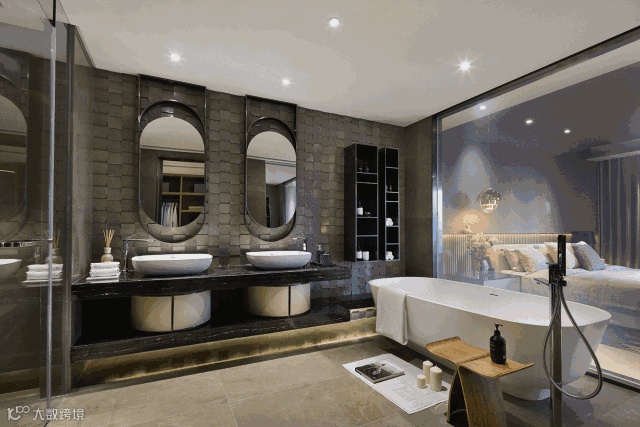 智能雾化玻璃分隔主卫与主卧,一键启动便可实现使用场景灵活调整。将自然粗犷的质感移植主卫,在悬吊镜面与金属架的结合下,兼具功能与亮点。