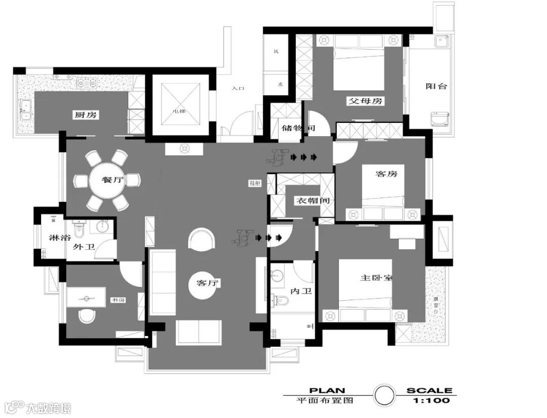 主卧室的进口独立朝向客厅一边,主卧和父母房互不干扰,又增加了更衣室的空间,使主卧室变成一个独立的空间