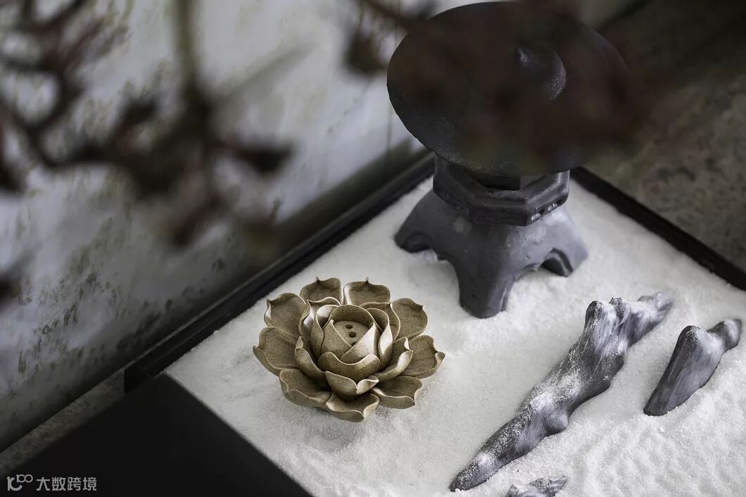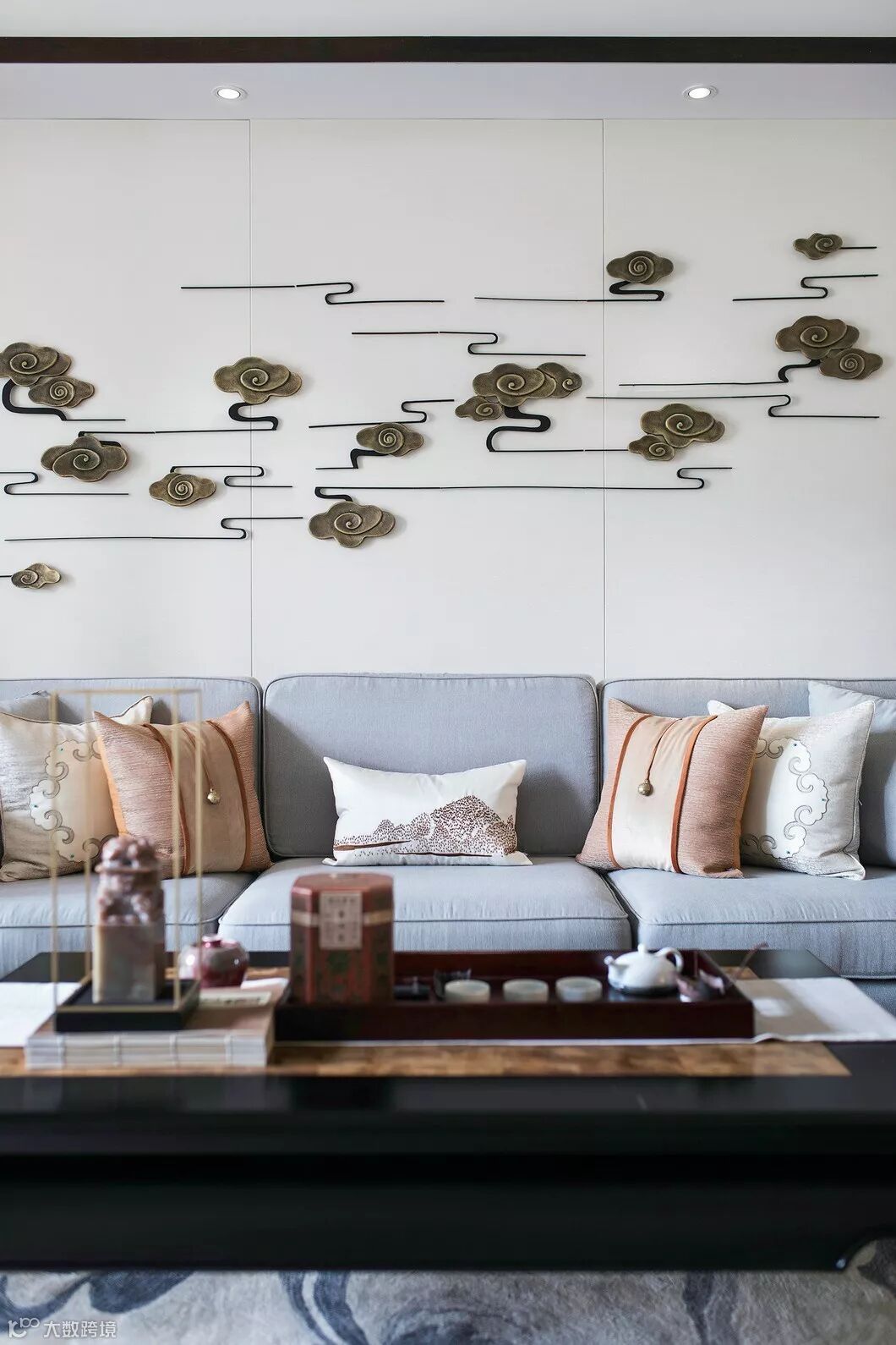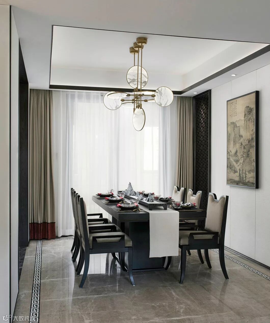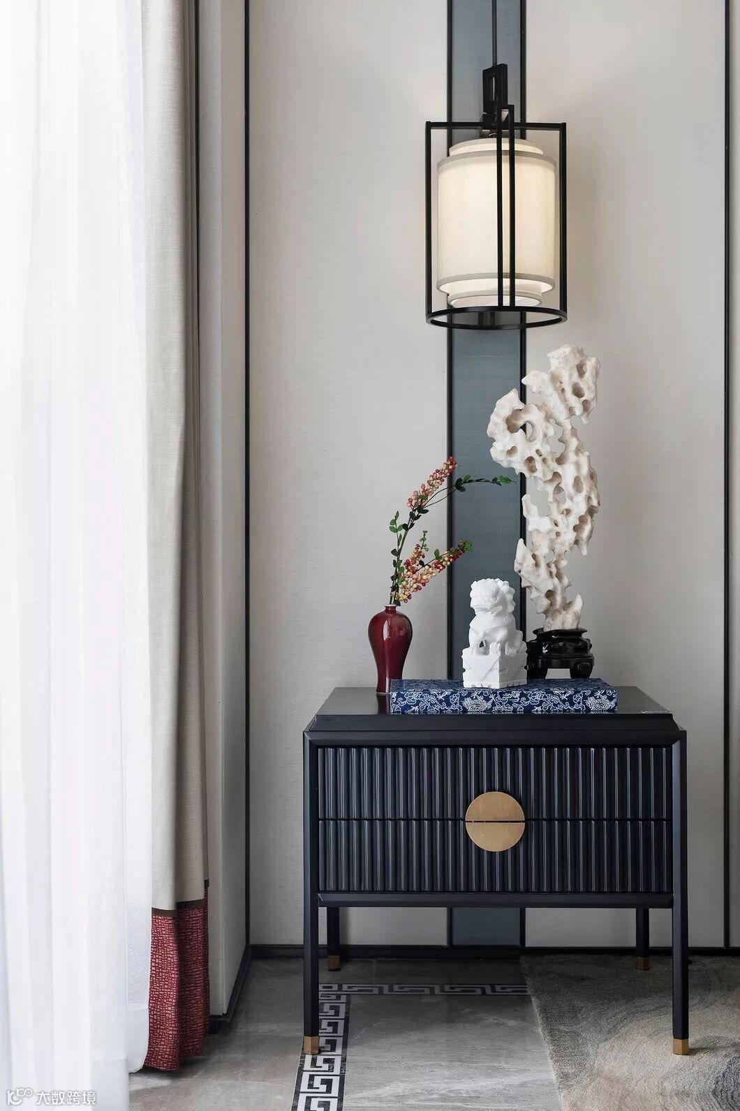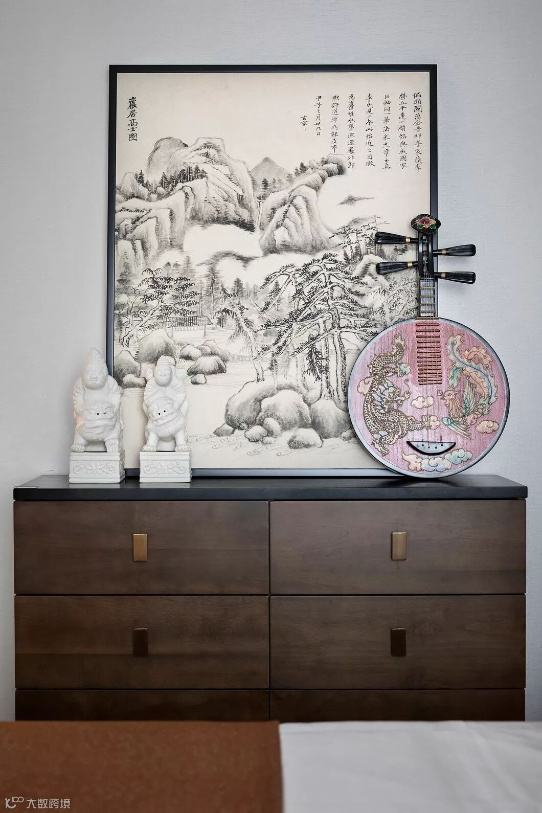 新中式实木桌椅、屉柜与现代简约软包和大理石材质融合相映,迎客松盆栽、巧致印章、纤细花艺、山水画、刺绣手作、枯山石微缩小景等传统东方元素装点着空间,让传统中式的情韵得以延展开来。