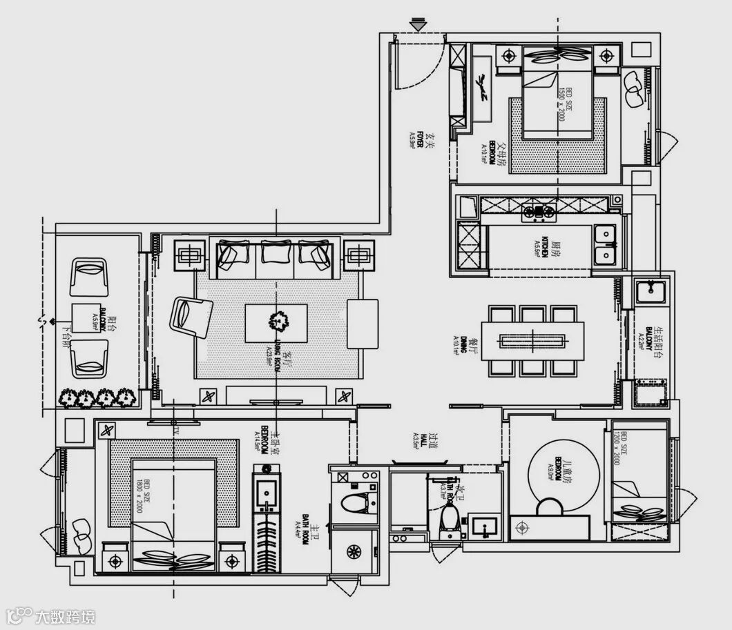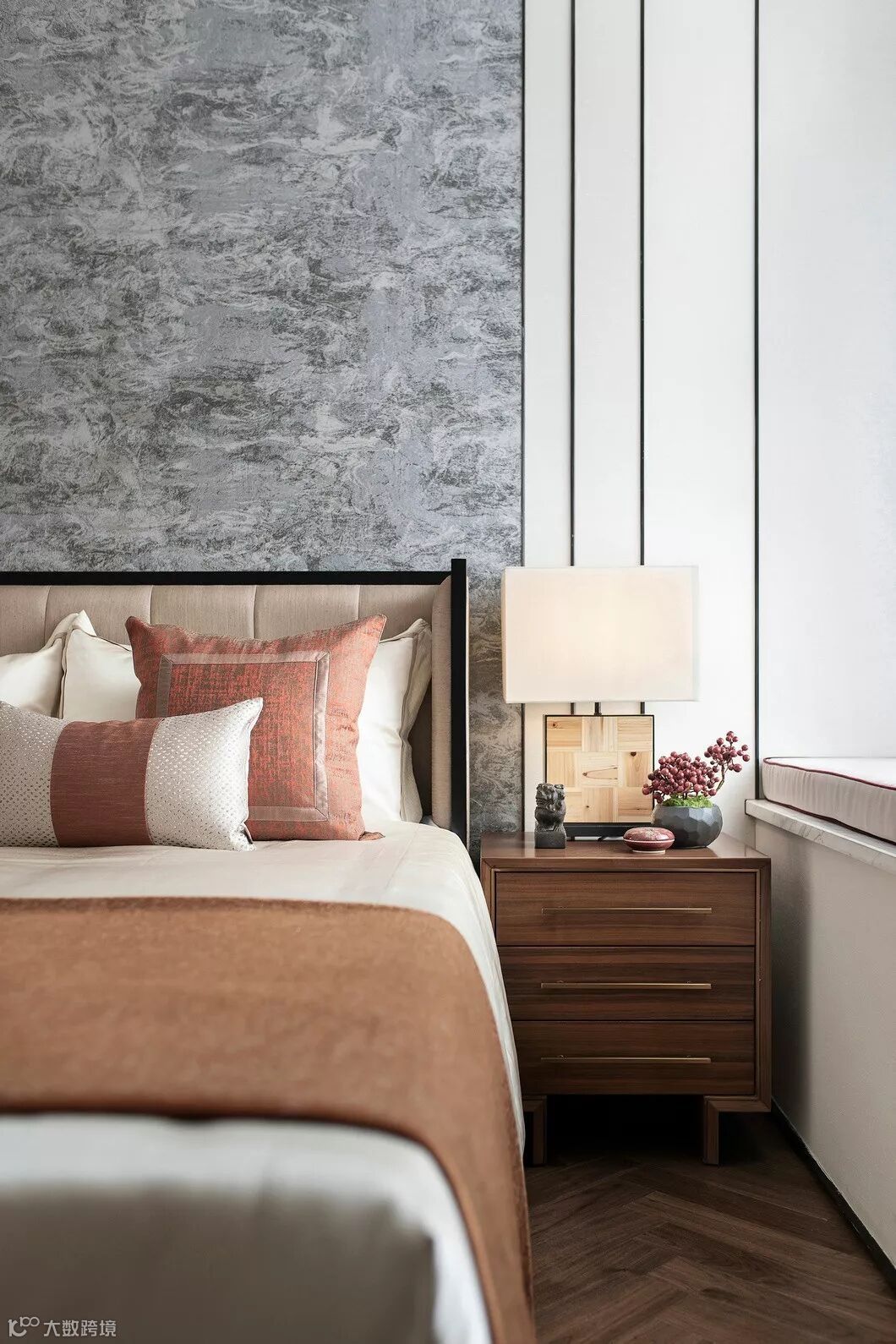 次卧有着琴瑟和鸣的煦煦情意,温润的烟色恰到好处地在这浅灰色调空间内盈盈绽放开来,描绘着“秋天静如水,远岫碧侵云”的画面,营造一个予人安静休憩的心灵佳所。