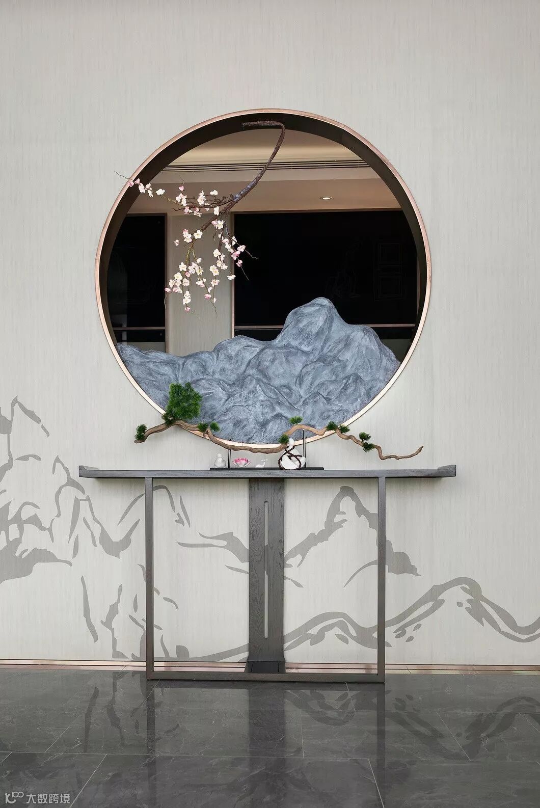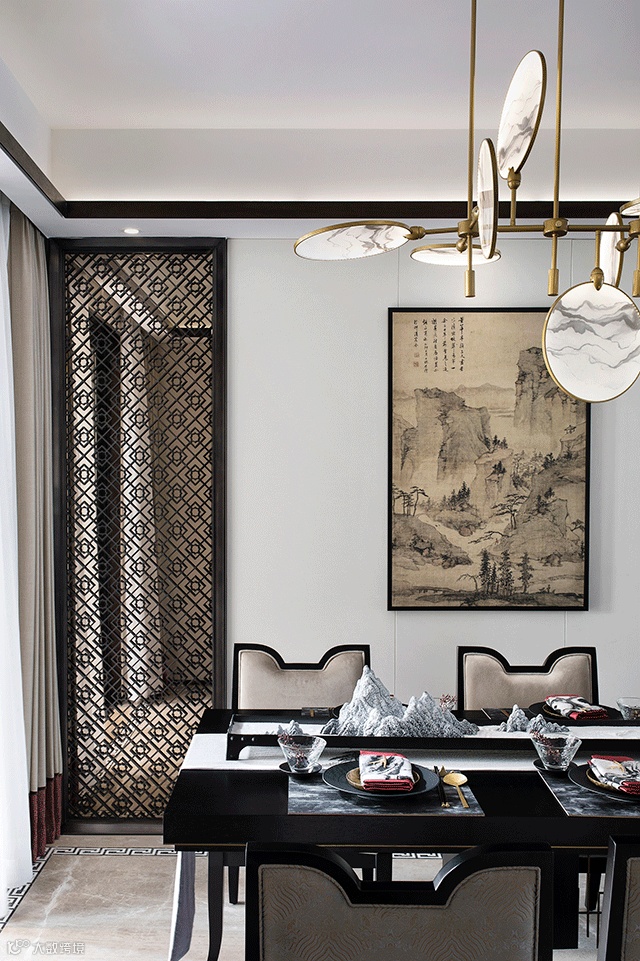设计延续项目售楼会所的浓郁中式格调,于水墨山川画中发散思绪,烟霞入诗,云树成画,灵动雅丽的自然素韵于空间中流转,为生活添一分安然淡雅气韵。