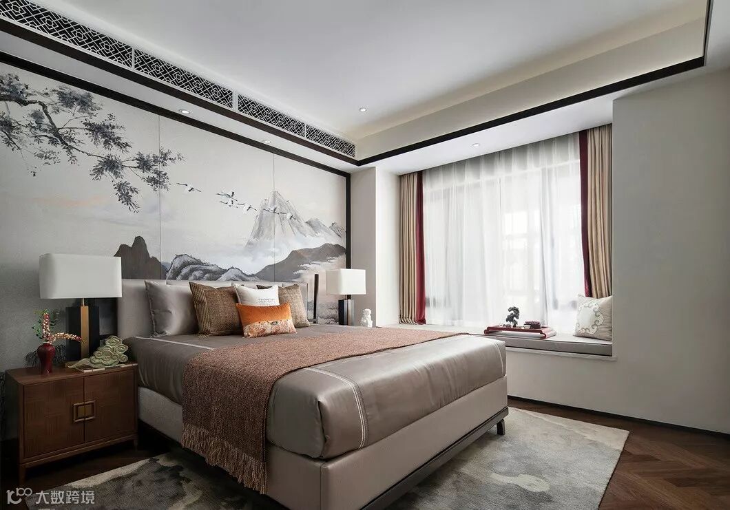 主卧延续着清冽的水墨韵调,淡淡的墨韵梅香,在床头浓郁地弥散开来。