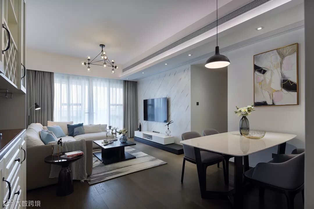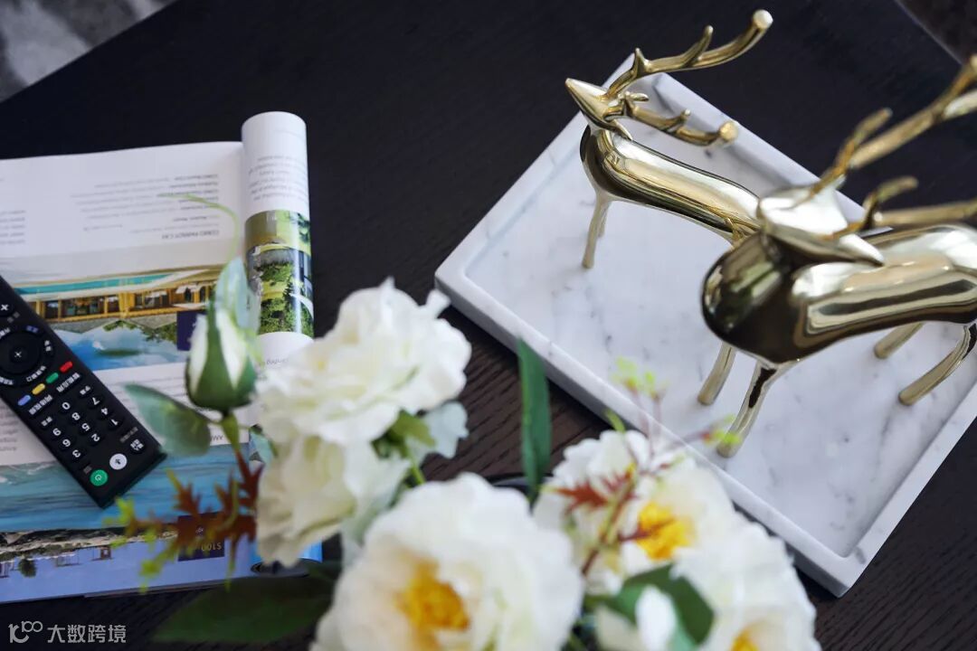 沙发旁造型独特的案几,工字型的茶几,墨色底的电视柜,搭配几个让人耳目一新的小物件,简单又美观,用来招待三五好友享受静谧的下午时光也真真是极好。